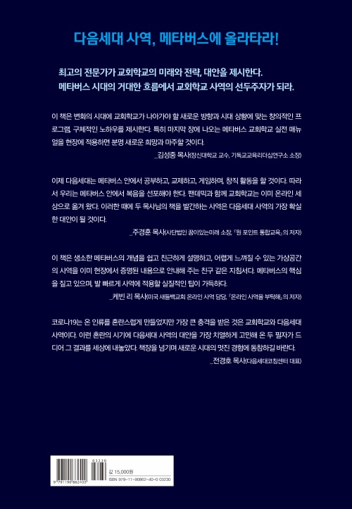 이제 다음세대는 메타버스 안에서 공부하고, 교제하고, 게임하며, 창직 활동을 할 것이다. 이제 메타버스 안에서 복음을 선포해야 한다. 팬데믹과 함께 교회학교는 이미 온라인 세상으로 옮겨 왔다. 이러한 때에 두 목사님의 책을 발간하는 것은 다음세대 사역의 가장 확실한 대안이 될 것이다.