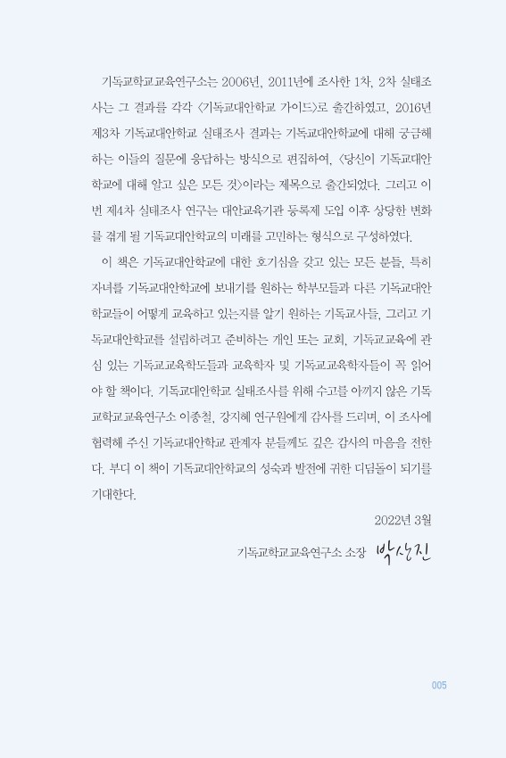 이 책은 기독교대안학교에 대한 호기심을 갖고 있는 모든 분들, 특히 자녀를 기독교대안학교에 보내기를 원하는 학부모들과 다른 기독교대안학교들이 어떻게 교육하고 있는지를 알기 원하는 기독교사들, 그리고 기독교대안학교를 설립하려고 준비하는 개인 또는 교회, 기독교교육에 관심 있는 기독교교육학도들과 교육학자 및 기독교교육학자들이 꼭 읽어야 할 책이다. 기독교대안학교 실태조사를 위해 수고를 아끼지 않은 기독교학교교육연구소 이종철, 강지혜 연구원에게 감사를 드리며, 이 조사에 협력해 주신 기독교대안학교 관계자 분들께도 깊은 감사의 마음을 전한다. 부디 이 책이 기독교대안학교의 성숙과 발전에 귀한 디딤돌이 되기를 기대한다.