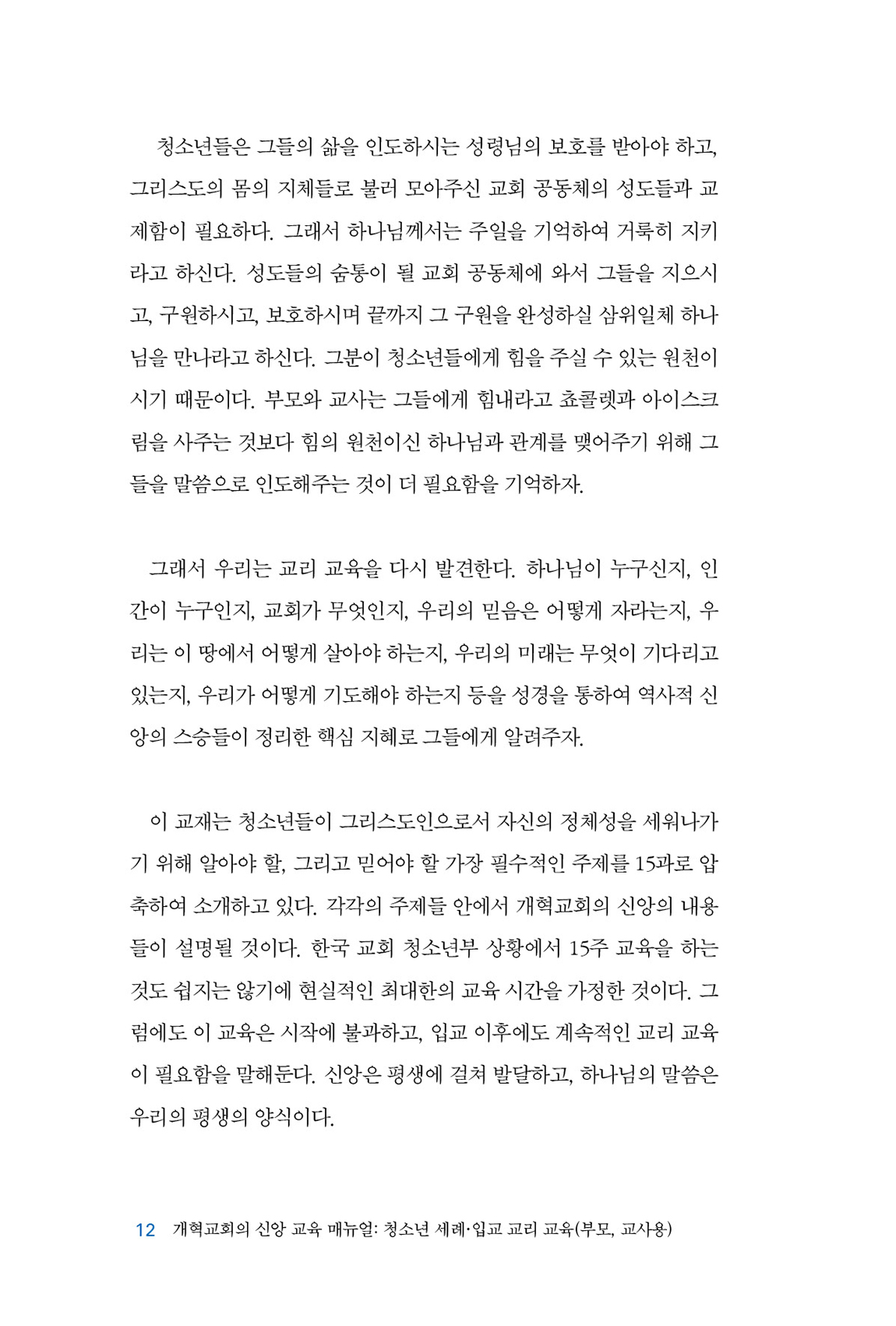 우리의 아이들이 살아가는 세상은 직관적이고 감성적이어서 자신의 신앙을 확증하는 기회를 갖기 쉽지 않다. 반면 부흥의 시기를 몸으로 체험한 기성세대들은 그들이 지금도 살아서 역사하시는 하나님을 알아차리지 못할까 걱정하고 있다. 저자의 친절하고 차분한 글은 직관적인 청소년과 논리적인 기성세대를 연결하여 초월적 교리를 자연스럽게 이해할 수 있도록 해준다. 믿음의 고백을 하며 매년 교회에서 문답에 응하여 세례를 받거나, 부모님의 신앙고백을 자신의 것으로 받아들여 입교하는 청소년들을 바라보는 것은 색다른 감동을 준다. 이 책을 통해 더 많은 청소년들이 막연하게 마음으로 만 믿고 있던 믿음에 대해 확신하며 입으로 시인하여 구원에 이르는 역사가 많아지길 기도한다.
