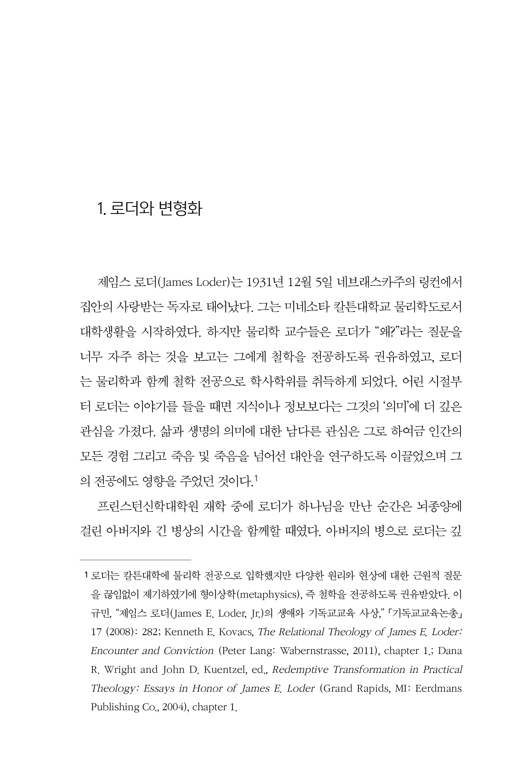 이 책의 저자들은 금광을 탐색하다 금맥을 찾은 것처럼 제임스 로더라는 금광과 금맥에 빠져들었다. 기독교교육 이론 및 실천의 계보를 크게 ‘회심/양육’, ‘변형화/사회화’라는 양대 축으로 양분한다면 제임스 파울러는 후자를, 제임스 로더는 전자를 대표하는 학자이다. 제임스 파울러에 대한 연구는 심도 있게 수행되어 온 반면에, 제임스 로더에 대한 연구가 국내에서는 ‘변형의 논리’와 ‘4차원적 현실 인식’ 외에는 심도 있는 연구가 부족하였다. 저자들은 상대적으로 연구가 부족한 로더의 기독교교육론에 주목하여 로더의 교육론이 우리가 살아가는 이 시대에 여전히 깊은 통찰과 새 희망의 빛을 제시해주고 있음을 발견하였다.