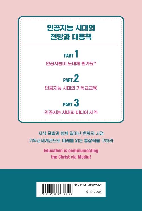 인공지능이 무엇인지, AI가 우리의 삶에 어떤 영향을 미치고 있는지, 미디어는 우리 삶의 영역에서 얼마만큼 영향력을 끼치고 있는지, 기독교교육이 왜 우리에게 중요한지 진지하게 고민해 본 적이 있는가? 그리스도인이라면 마땅히 해야 할 질문이지만 우리는 이에 대해 깊이 생각하지 않고, 고민하려 하지 않으며, 심지어 회피하려고 한다. 그 사이 인공지능과 미디어는 우리의 삶 깊은 곳까지 지배력을 확대하기 위해 다가오고 있다. 이제는 더 이상 피할 수 없다!