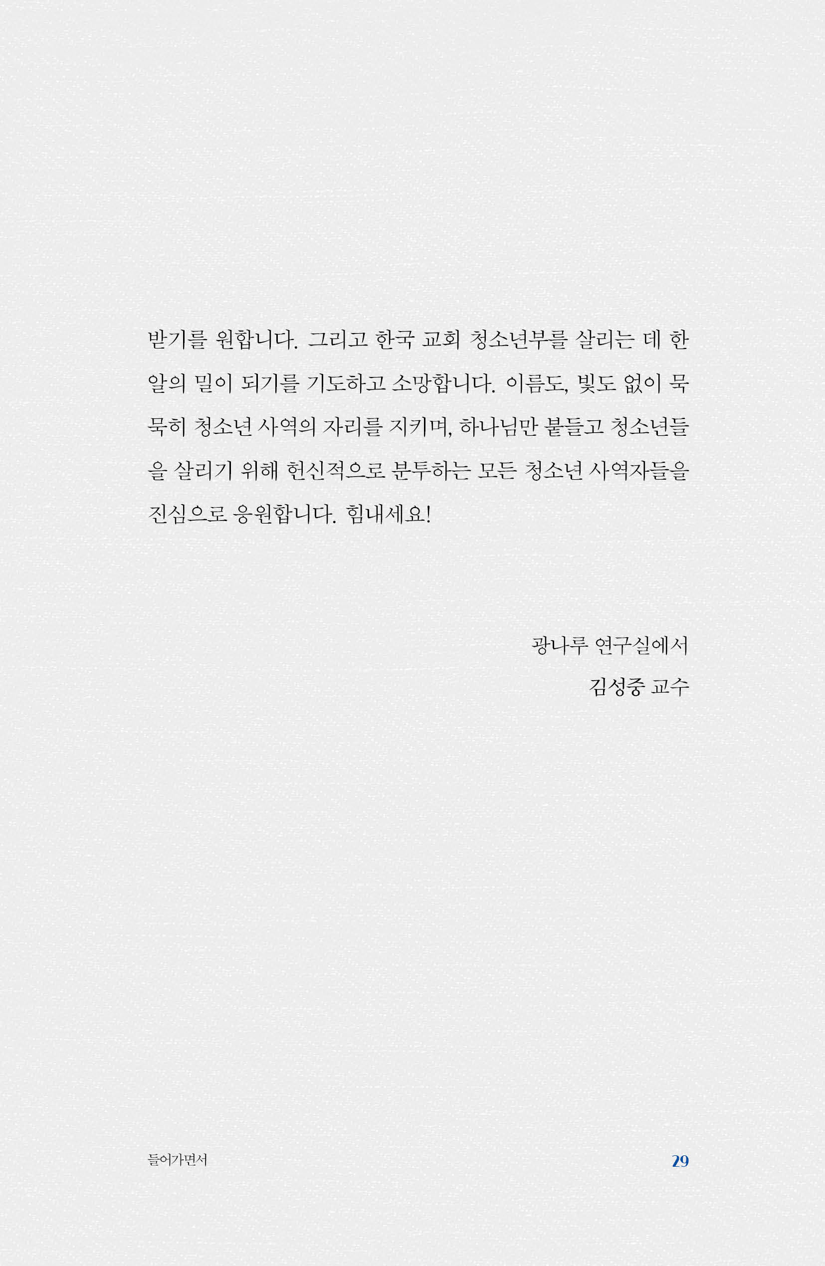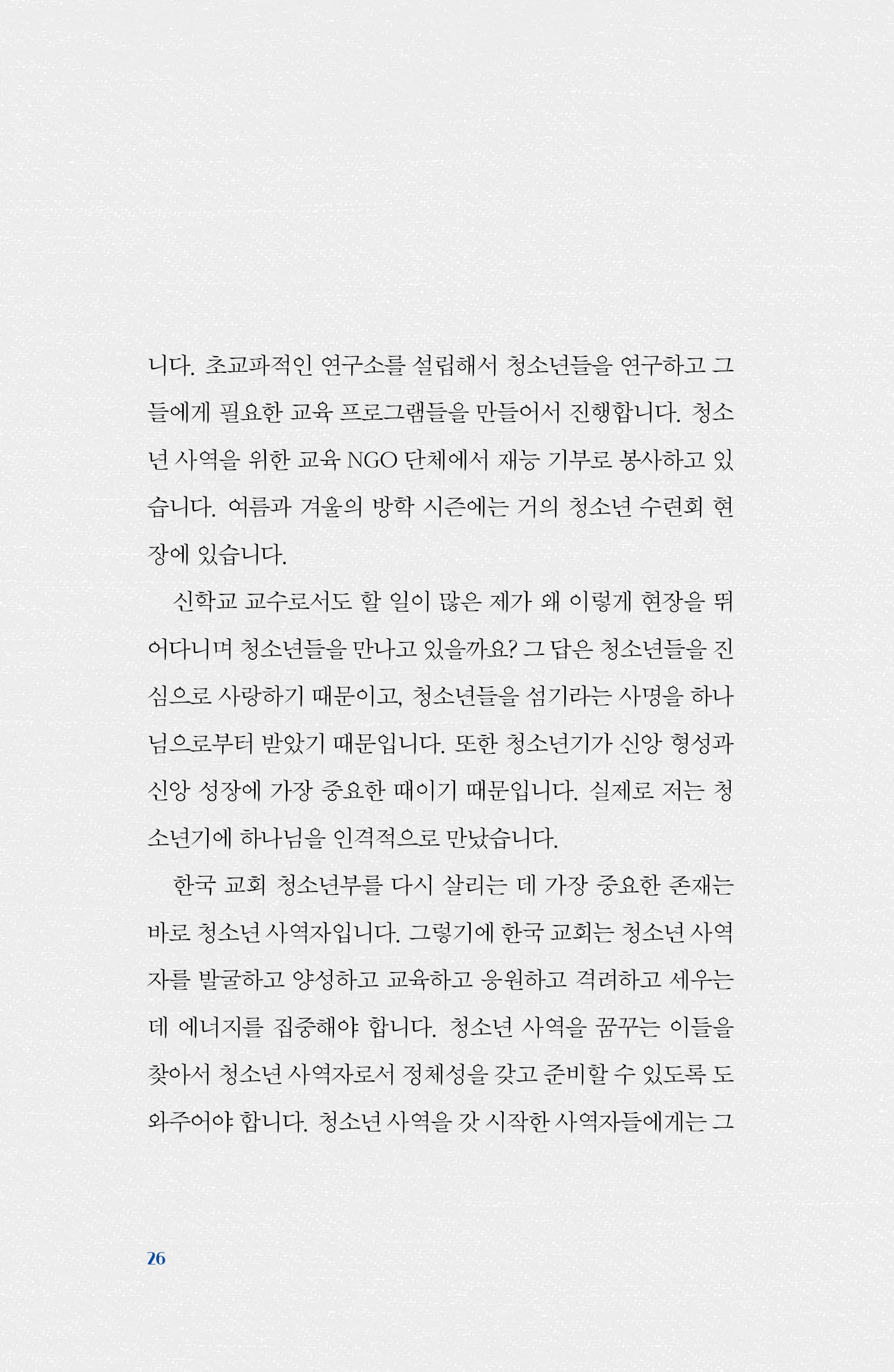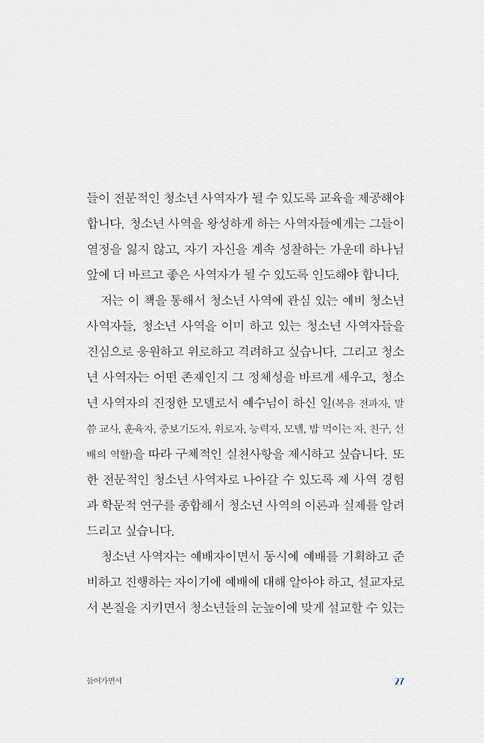 이 책을 통하여 더 좋은 청소년 사역자가 더 많이 세워질 수 있기를 간절히 기도합니다.