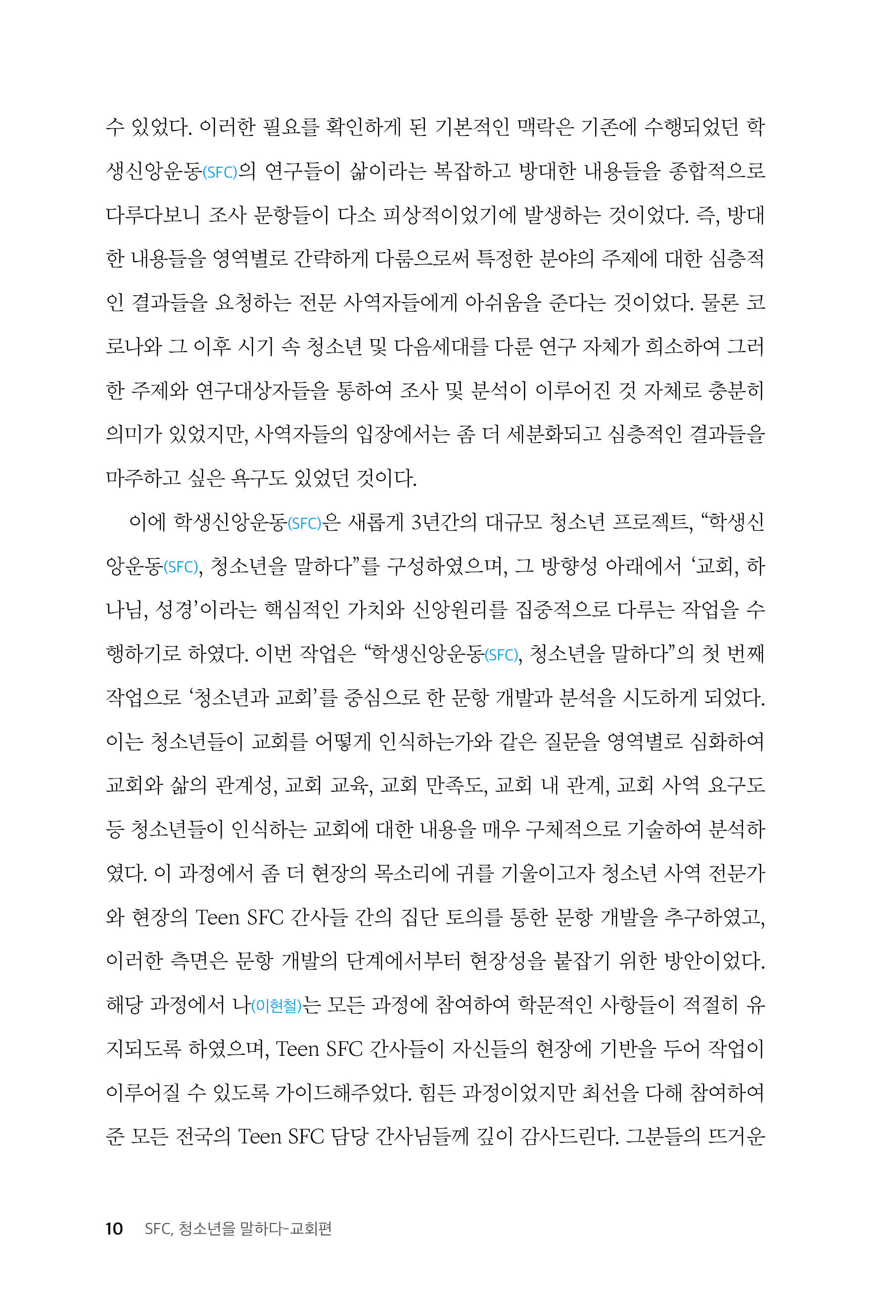 이에 학생신앙운동(SFC)은 새롭게 3년간의 대규모 청소년 프로젝트, “학생신앙운동(SFC), 청소년을 말하다”를 구성하였으며, 그 방향성 아래에서 ‘교회, 하나님, 성경’이라는 핵심적인 가치와 신앙원리를 집중적으로 다루는 작업을 수행하기로 하였다. 이번 작업은 “학생신앙운동(SFC), 청소년을 말하다”의 첫 번째 작업으로 ‘청소년과 교회’를 중심으로 한 문항 개발과 분석을 시도하게 되었다. 이는 청소년들이 교회를 어떻게 인식하는가와 같은 질문을 영역별로 심화하여 교회와 삶의 관계성, 교회 교육, 교회 만족도, 교회 내 관계, 교회 사역 요구도 등 청소년들이 인식하는 교회에 대한 내용을 매우 구체적으로 기술하여 분석하였다. 이 과정에서 좀 더 현장의 목소리에 귀를 기울이고자 청소년 사역 전문가와 현장의 Teen SFC 간사들 간의 집단 토의를 통한 문항 개발을 추구하였고, 이러한 측면은 문항 개발의 단계에서부터 현장성을 붙잡기 위한 방안이었다.