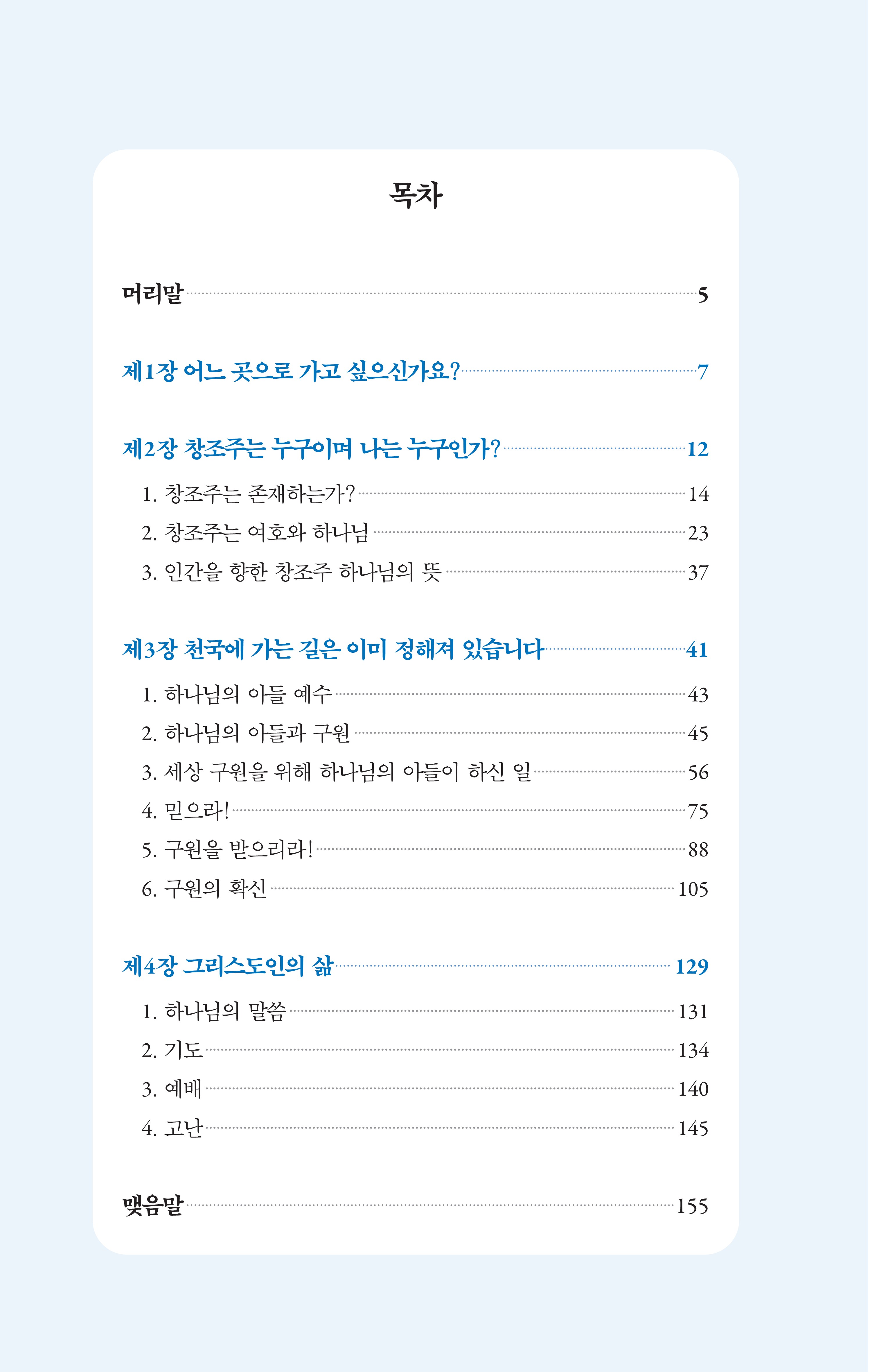 이 책을 읽으시는 분들이 기독교에 대해, 복음에 대해, 하나님과 예수 그리스도에 대해, 그리고 이 땅에서의 삶의 의미와 삶의 목적에 대해 다시 한번 생각해 보고 그에 대한 올바른 답을 찾아 참된 그리스도인으로 살아갈 수 있는 계기가 되기를 기대합니다.