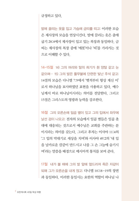 이 책은 목회자들도 어렵게 여기던 요한계시록을 누구나 쉽게 이해하고 묵상하도록 돕는 책이다. 저자는 ‘묵상 열기’, ‘본문 여행’, ‘묵상 여행’, ‘나의 결단’이라는 쉽고 분명한 단계를 통해 독자가 요한계시록 본문의 의미를 쉽고 정확하게 이해하고 오늘날 각자의 삶의 자리에서 적용할 수 있도록 친절하게 안내하고 있다. 이 책은 혼돈의 시대에 소망을 잃고 낙심한 교회에 하나님 나라의 복음과 공의, 위로와 소망을 제시해 줄 것이다.