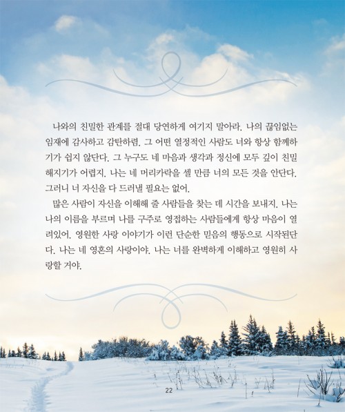 크리스마스를 앞두고, 그리고 한 해를 정리하면서 분주한 마음을 잠시 내려놓고 주님 앞에 머무르게 합니다. 그리고 주님이 들려주시는 음성을 통해 진정한 크리스마스의 의미를 깨닫고, 예수님이 이 땅에 선물로 오심을 기뻐하며 크리스마스를 기념하도록 도울 것입니다. 또한, 주님과 함께 한 해를 마무리하며 말씀으로 새해를 준비하도록 이끌 것입니다. 이 책을 통해 이 시즌에 주님이 들려주시는 말씀을 들으며 그분과 더 깊은 교제를 누리시길 바랍니다. 크리스마스의 주인공인 예수님이 주시는 위로와 기쁨을 경험하세요.