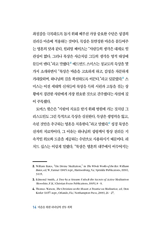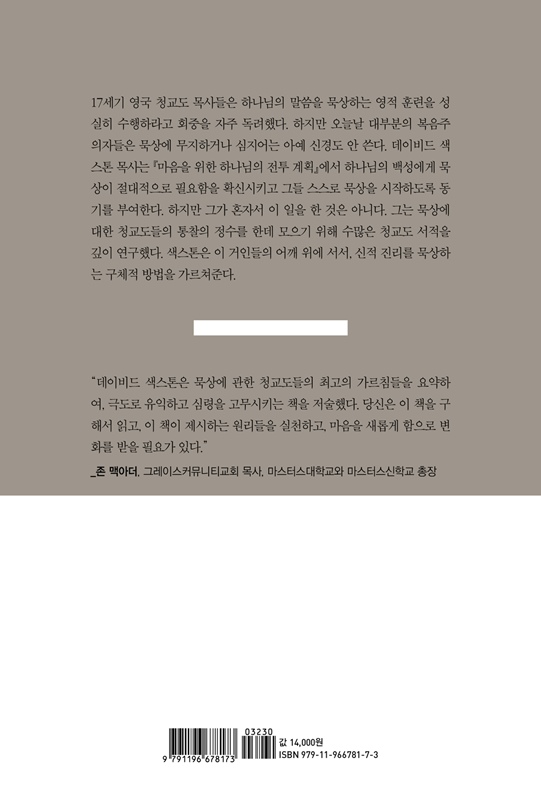 대중들이 생각하는 묵상 개념은 신비주의, 뉴에이지, 동양 종교의 영향으로 아주 기형적으로 뒤틀리게 되었다. 이 때문에 오늘날 건전한 그리스도인들 중에도, 묵상이 필수적인 영적 실천사항이라고 언급하면 이에 움찔하는 사람들이 있다. 그러나 성경 말씀의 의미를 조용히 신중하게 집중해서 반추하는 것보다 더 진리를 깨닫게 하고 성화시키는 것은 없다. 그것이 성경이 말하는 묵상의 의미이다. 시편 저자는 시편 119편에서만 무려 6번이나 하나님의 말씀의 법도, 약속, 율례를 묵상하겠다고 말한다. 청교도들은 거룩함을 덧입은 매일의 사고 활동과 관련하여 성경적 묵상이 가지는 중요한 역할에 대해 많은 것을 말했다. 데이비드 색스톤은 묵상에 관한 청교도들의 최고의 가르침들을 요약하여, 극도로 유익하고 심령을 고무시키는 책을 저술했다. 당신은 이 책을 구해서 읽고, 이 책이 제시하는 원리들을 실천하고, 마음을 새롭게 함으로 변화를 받을 필요가 있다.