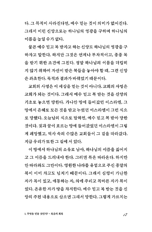 예수 믿고 건강의 복, 물질의 복, 자녀의 복을 받는 것을 복음이라고 말하면, 그런 복들을 받지 못한 신자들은 예수님을 잘못 믿은 것이 된다. 또한 그렇게 해서 받은 복들을 제쳐두고 하나님의 이름을 높여야 할 때, 그렇게 해서 받은 복들보다 예수님의 뜻을 더 좇아야 할 때, 그런 복들을 쉽게 놓지 못한다. 왜냐하면 예수 믿은 목적이 그런 복들이었기 때문이다. 그 목적이 사라진다면, 예수 믿는 것이 의미가 없어진다. 그래서 이런 신앙으로는 하나님의 영광을 구하며 하나님의 이름을 높일 수가 없다. 물론 예수 믿고 복 받자고 하는 신앙도 하나님의 영광을 구하자고 말한다. 하지만 그것은 언제나 부차적이고, 종종 복을 받기 위한 조건에 그친다. 정말 하나님의 이름을 더럽히지 않기 위하여 자신이 받은 복들을 놓아야 할 때, 그런 신앙은 좌초한다. 목적과 결과가 바뀌었기 때문이다. _ 1. 무엇을 믿을 것인가?: 예수 믿고 받는 최고의 복