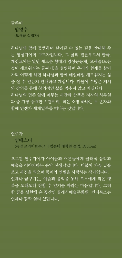 한국, 개신교에는 없던 새로운 형태의 영성공동체인 모새골(모든 것이 새한국, 개신교에는 없던 새로운 형태의 영성공동체인 모새골(모든 것이 새로워지는 골짜기) 설립자이자 영성가로서 평생 구도자로서의 삶을 살기로 결단하고, 한길을 걸어온 아버지 임영수 목사님과 클래식예술문화원과 킨더북스 대표이자 오르가니스트로서 아이들과 어른들에게 클래식 음악과 예술을 가르치는 음악 선생님인 딸 임에스더 작가가 함께 엮은 두 번째 40일 묵상책입니다. 묵상하는 삶에 발을 담그도록 돕는 첫 책 “동경의 시대를 사는 이들에게”에 이어, 본서는 예수 그리스도의 고난과 부활이 오늘날 우리가 어떻게 새로운 실존으로 살아가도록 이끄는 눈부신 진리가 되는지 안내합니다. 책 안에 모새골 채플의 파이프 오르간으로 연주한 바흐의 코랄과 찬송가 연주 총 8곡이 QR코드로 담겨 있습니다.