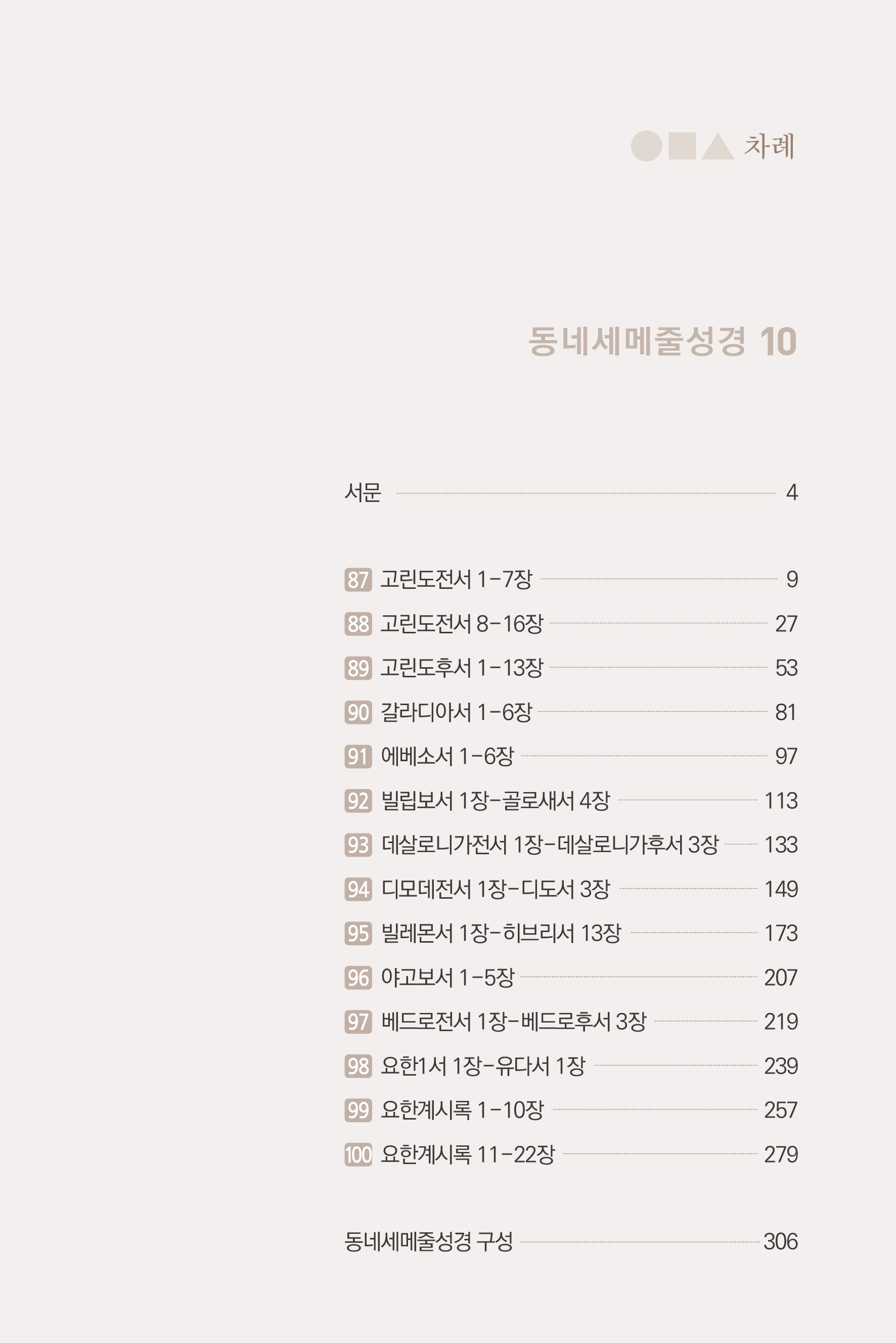 성경 전체를 구약 7권, 신약 3권으로 나누어 모두 10권으로 구성했다. 1권부터 차례로 사용하거나 신약부터 시작하거나, 또는 어떤 책을 선택해서 먼저 사용해도 상관이 없다.