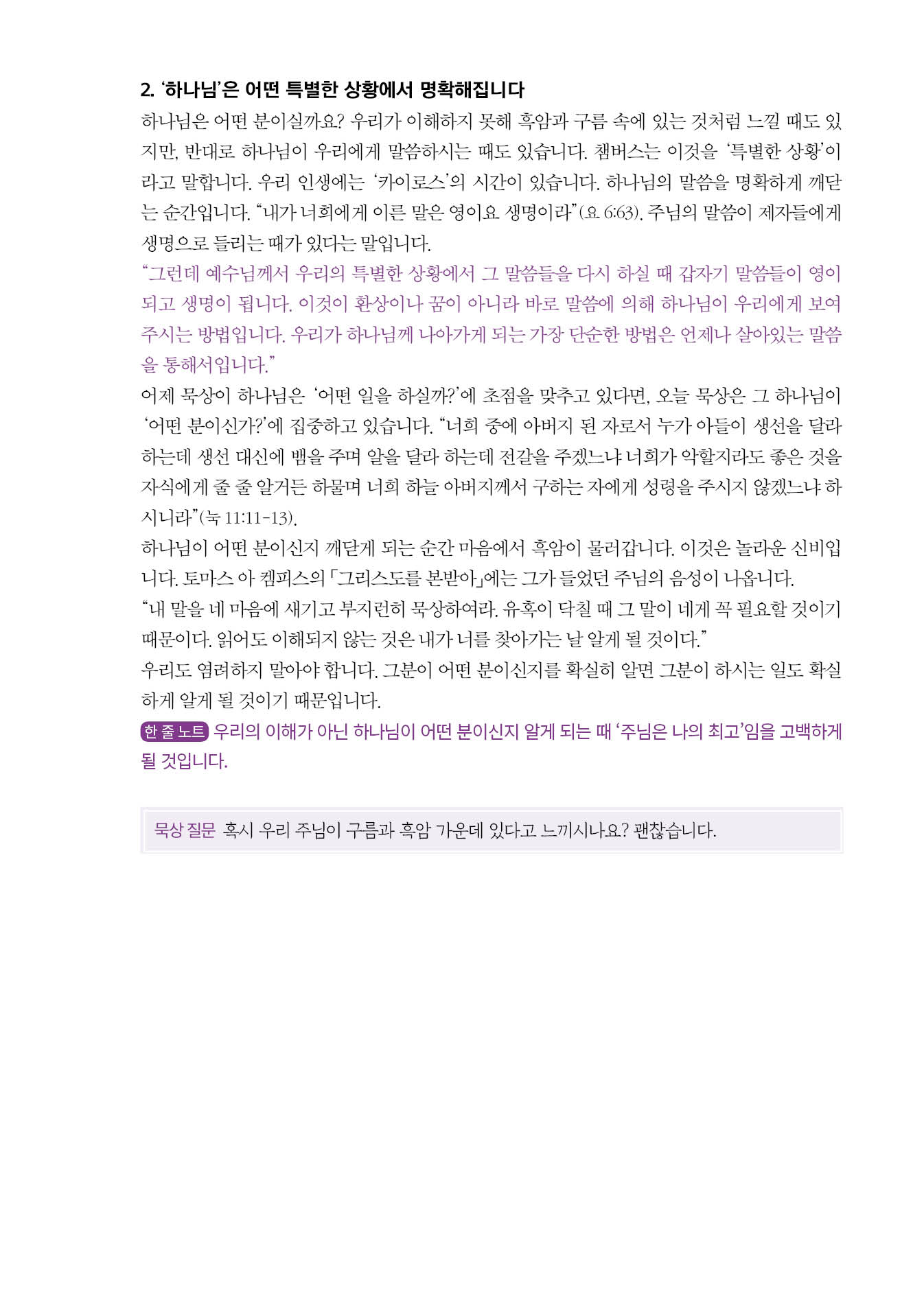 따뜻한 마음입니까, 무관심한 마음입니까? ∙ 최상의 영광 ∙ “너도 알았더라면!” ∙ 축복보다 하나님을 바라십시오! ∙ 주님의 고통과 우리의 친교 ∙ 하나님과 죄의 충돌 ∙ 부활하신 생명과 연합할 때 ∙ 주님께서 부활하신 목적 ∙ 예수님을 보았습니까? ∙ 함께 십자가에 못 박힘 ∙ 함께 부활에 참여함 ∙ 영생을 나눔 ∙ 모든 짐을 주님께 맡기십시오! ∙ 불평을 찬송의 시로 바꾸시는 분 ∙ 영적 집중이 약해질 때 ∙ 말만 하지 말고 실천하십시오! ∙ 감정이 아니라 의지입니다 ∙ 준비된 사람 ∙ 작은 일에도 깨어 있으십시오! ∙ 감히 걱정함으로 하나님을 모욕합니까? ∙ 이제 주님을 아프게 하지 마십시오! ∙ 영원히 꺼지지 않는 빛 ∙ 우상이 된 사역 ∙ 영적 방종에 대한 경고 ∙ 최상의 상태를 우상으로 만든다면 ∙ 잘못된 믿음들 ∙ 선물보다 주님을 구하십시오! ∙ “이 정도는 괜찮겠지”를 거절하십시오! ∙ 불확실성의 은혜 ∙ 사랑의 자발성