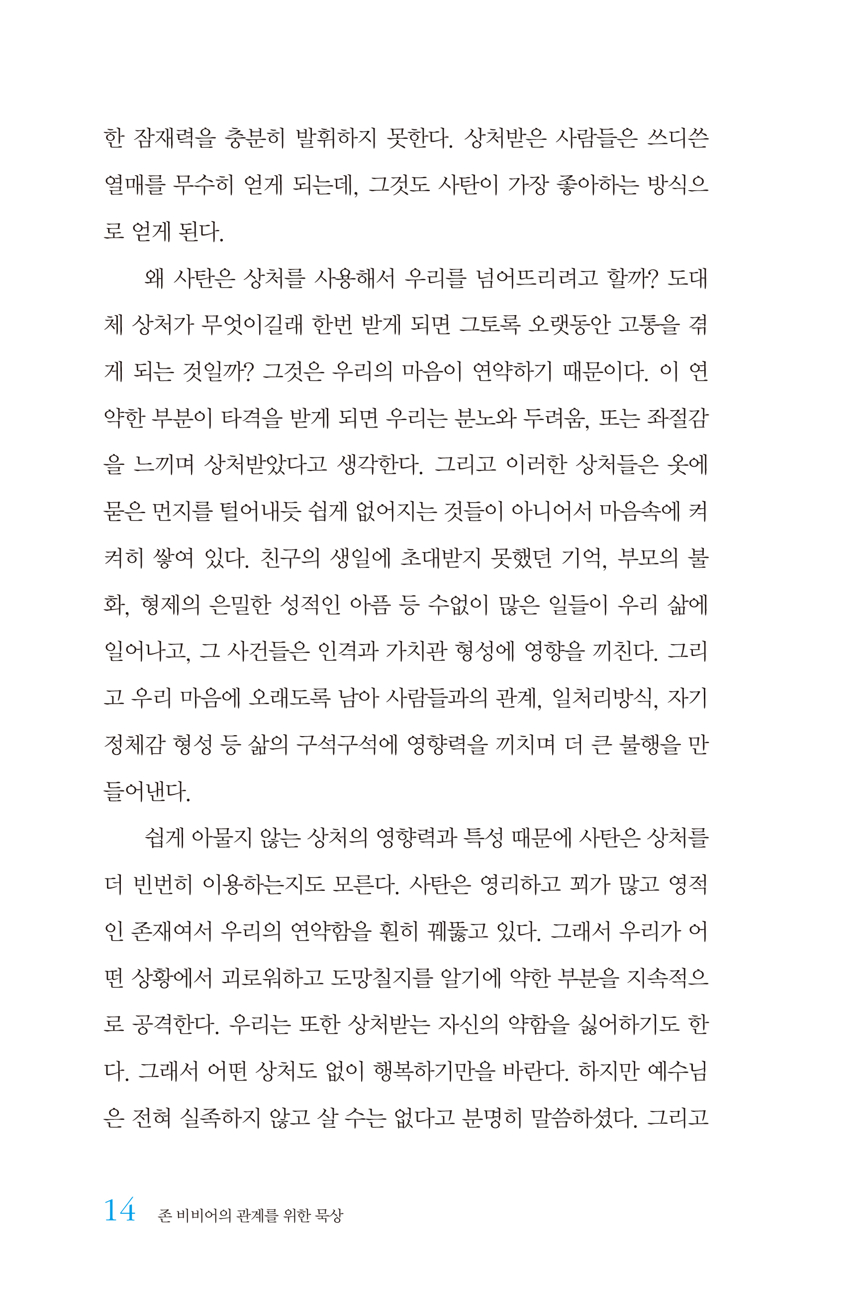 10만부 기념<존 비비어의 관계>를 발췌하고 내용을 보완한 책. 상처를 바라보는 시각과 태도를 30일간 점검하도록 구상된 묵상집이다. 여기에는 성경말씀과 마음가짐을 알아볼 수 있는 여러 질문을 포함하고 있어, 자신의 상태가 어떠한지 알 수 있다.쉽게 상처받을 수 있는 상황, 하나님 안에서 상처를 해결하는 지혜, 그리고 하나님의 자녀로서 우리의 모습을 3부로 나누어 설명하고 있다. 이 책의 순서를 따라 조용히 읽어 내려가면 상처의 근원과 그 의미를 하나님의 시각으로 파악할 수 있게 된다. 그리고 자신의 삶을 하나님 안에서 다시 정립할 수 있는 시간을 가질 수 있을 것이다. 존 비비어와 함께하는 30일 동안 상처가 회복되고 성숙의 열매로 변화되는 놀라운 경험을 체험하라.