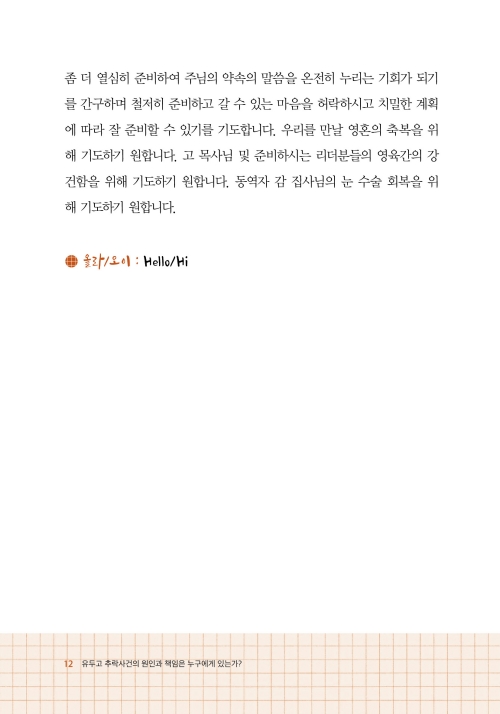 본서는 평범한 직장인인 저자가 아마존 단기선교를 준비하며 사도행전을 묵상한 기록을 담고 있다. 40개의 묵상글 중 하나인 유두고 추락 사건(행 20:7-12)은 선교 여행 시 주의해야 할 안전사고와 기도해야 할 것에 대해 사도행전 말씀을 통해 이야기하고 있다. 선교는 의무가 아니라 ‘하나님을 사랑하는 자에게 주신 약속’이며, 믿는 우리는 기쁨으로 땅끝에 가는 것으로 그 약속이 이루어짐을 깨닫게 된다. 성령과 권능의 약속을 붙잡고, 잃어버린 영혼에게 예수 그리스도를 전하기 위해 나아간 한 평신도의 뜨거운 영적 여정이 독자들에게 깊은 은혜와 도전을 선사할 것이다.
