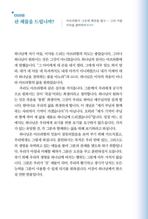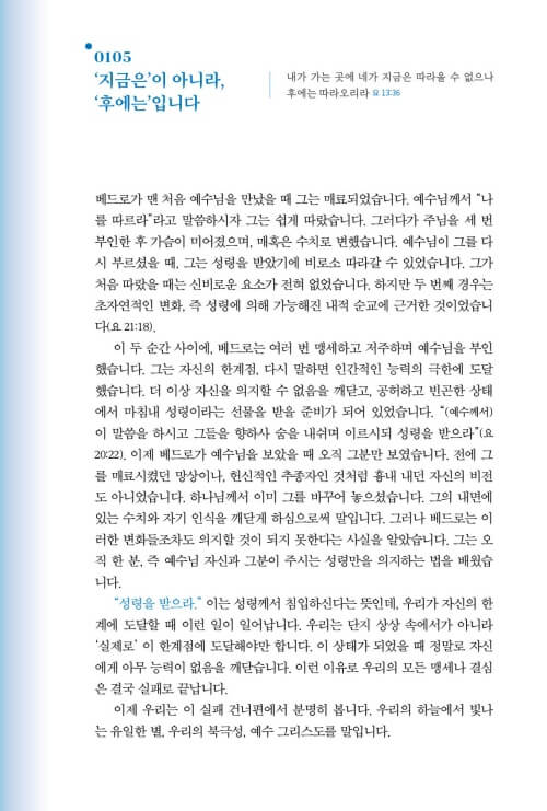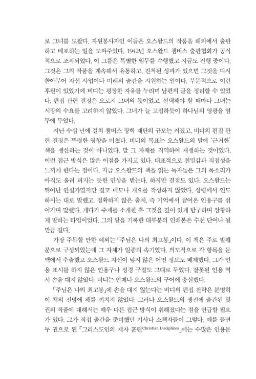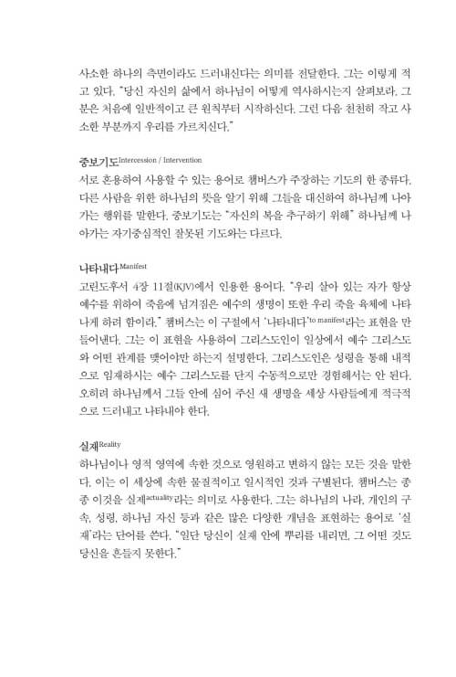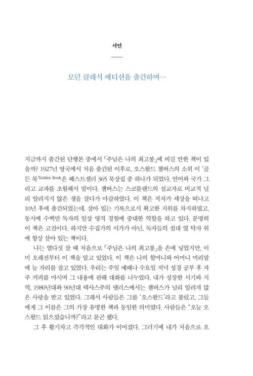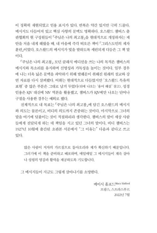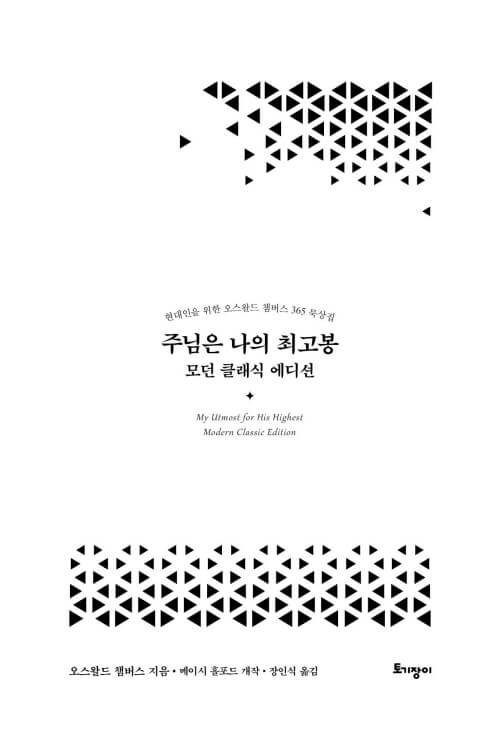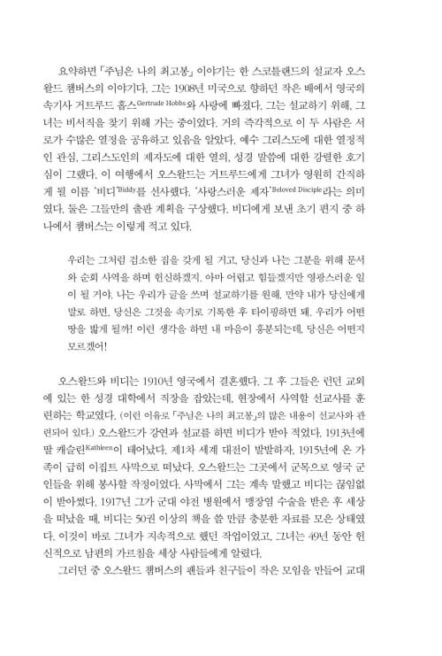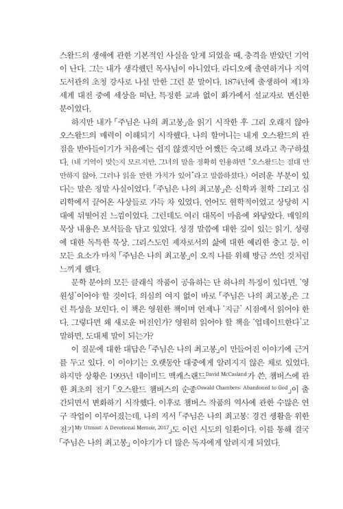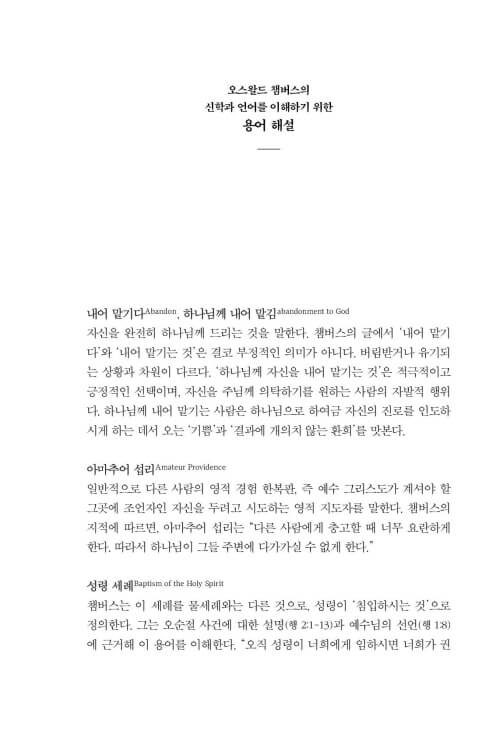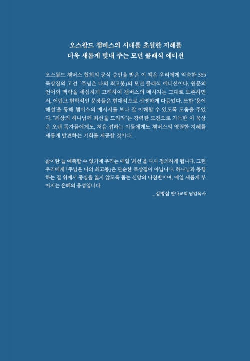 이 책을 펼치는 분들이 신앙의 많은 선배들이 그랬듯이, 또 제가 그랬듯이 챔버스가 그렇게도 사랑했던 하나님과의 친밀한 사귐 속으로, 깊이 초대받게 되기를 소망합니다. 하루하루의 일상이 예배가 되고, 그 일상의 예배가 ‘찢겨진 빵과 부어진 포도주’처럼 누군가를 위한 은혜의 통로가 되기를 바랍니다.