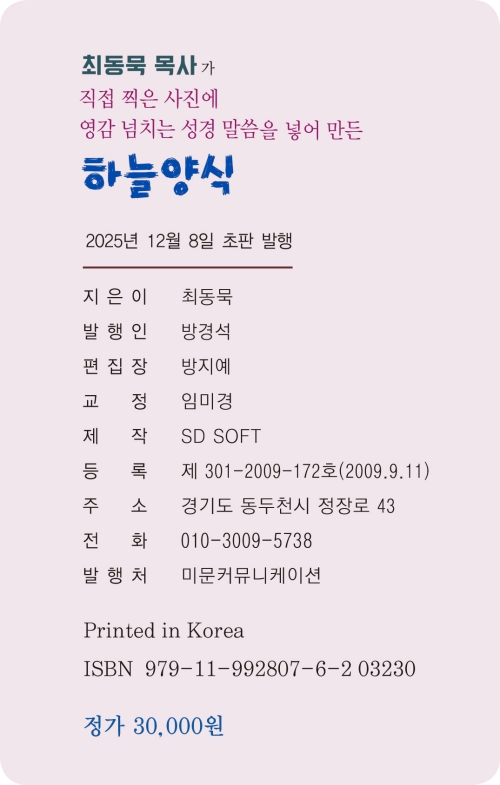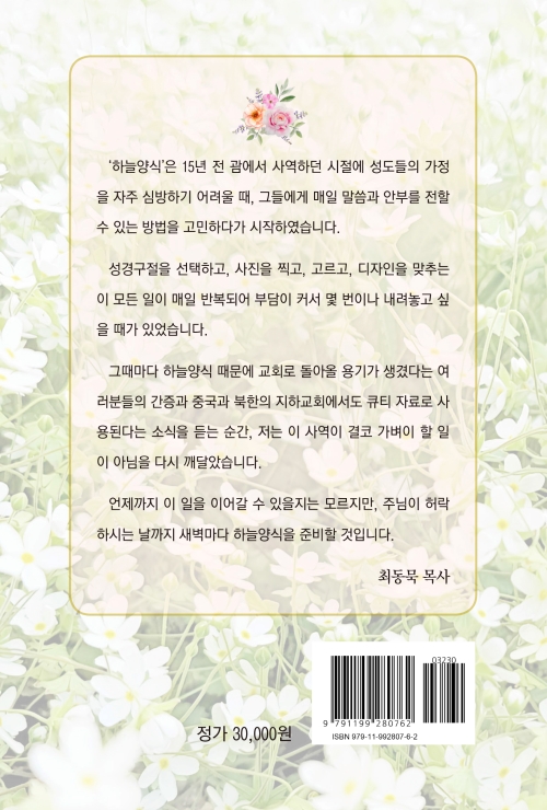 매일 보내는 것도 좋지만 1년 365일의 양식을 한 권의 책으로 묶어 묵상집으로 낸다면 어디서든 말씀을 먹을 수 있겠다’라는 생각에 출판 제안하여 결국 ‘하늘양식’이 책으로 나오게 되었습니다.