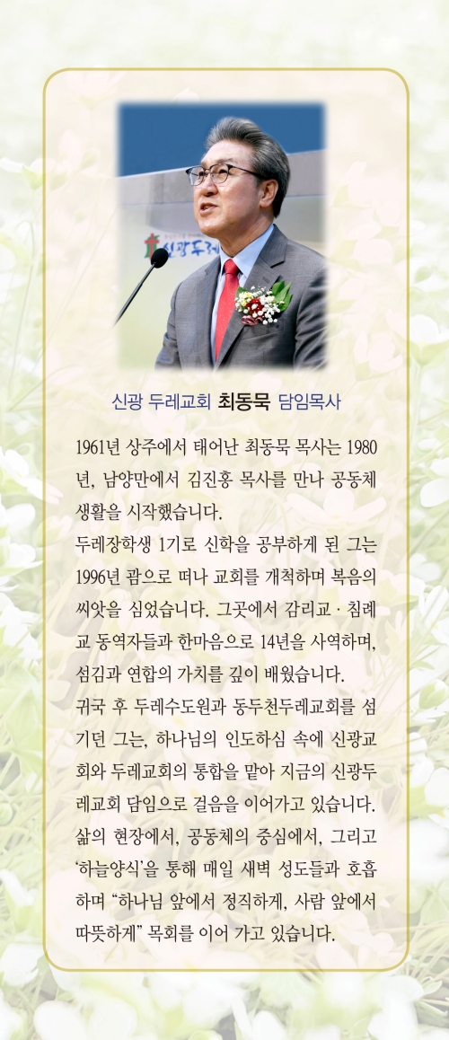 ‘하늘양식’은 최동묵 목사가 15년 전 괌에서 사역하던 시절에 성도들의 가정을 자주 심방하기 어려울 때, 그들에게 매일 말씀과 안부를 전할 수 있는 방법을 고민하다가 시작하였습니다.