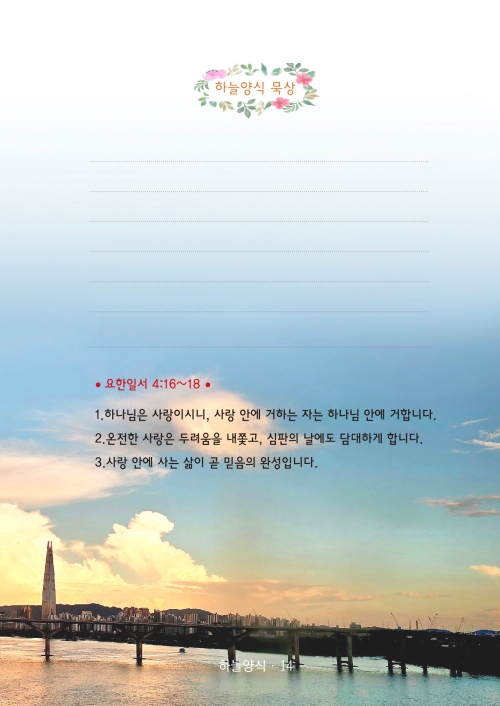 ◆ 칠일째는 하늘양식 묵상의 날입니다. 읽거나 암송한 말씀을 삶에 적용하시면서 느낀 점들을 기록하여 잊지 않도록 가슴에 새깁니다. 묵상 아래의 저자 묵상 글을 통해 말씀의 은혜가 넘치기를 소망합니다.