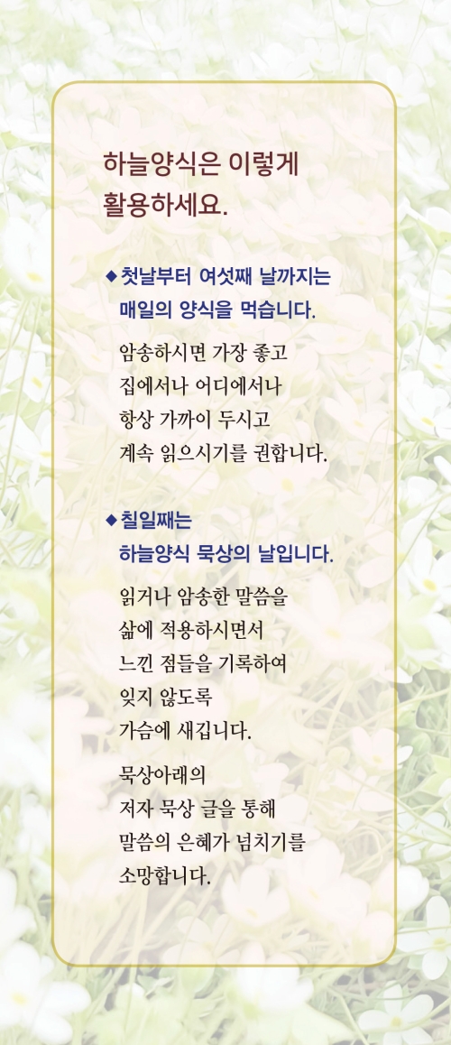 ◆ 첫날부터 여섯째 날까지는 매일의 양식을 먹습니다. 암송하시면 가장 좋고 집에서나 어디에서나 항상 가까이 두시고 계속 읽으시기를 권합니다.