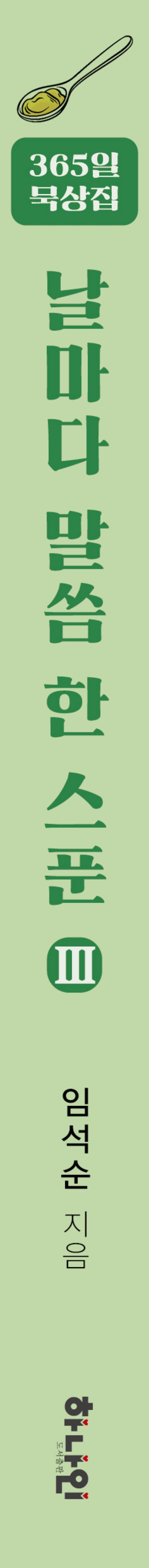 밥 한 숟가락이 생명을 유지하게 하듯, 말씀의 한 스푼은 우리의 영혼을 회복시키고 하루를 살아낼 힘을 줍니다. 바쁜 하루, 영혼까지 챙길 여유가 없을 때 하루 한 번, 말씀 앞에 조용히 서는 시간이 당신의 인생을 서서히 바꾸기 시작할 것입니다. 당신의 하루를 말씀으로 깨우고, 당신의 영혼을 하나님께로 돌리며, 당신의 삶을 은혜의 길 위에 세우는 365일 묵상집! 날마다 말씀 한 스푼입니다. 짧지만 깊은 묵상으로, 오늘을 하나님과 동행하세요.