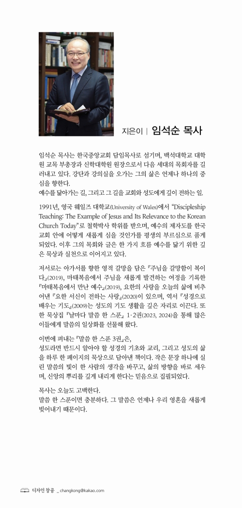 말씀 한스푼 3권은 성경 66권과 기독교 교리, 그리고 교회 공동체의 삶을 따뜻하고 간결한 언어로 풀어낸 매일 묵상집입니다. 복잡한 신학을 단순화하되 얕아지지 않도록, 성경의 깊이를 일상의 언어로 옮기되 본질이 손상되지 않도록, 개혁주의 신학이 지켜 온 말씀의 중심성과 하나님의 주권을 문장 속에 온전히 담고자 했습니다. 말씀은 짧게 제시되지만, 그 안에 담긴 진리와 은혜는 독자의 마음속에서 깊게 스며들어 오래 머물기를 바라는 마음으로 기록했습니다.