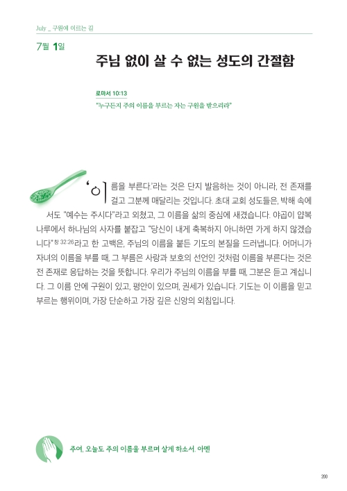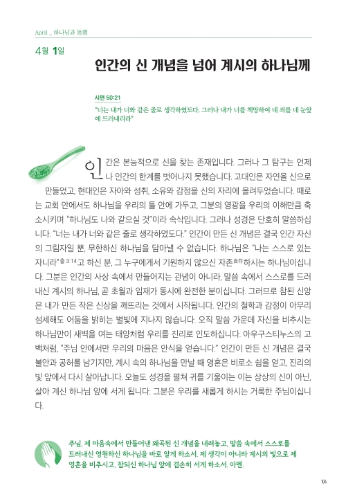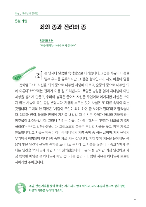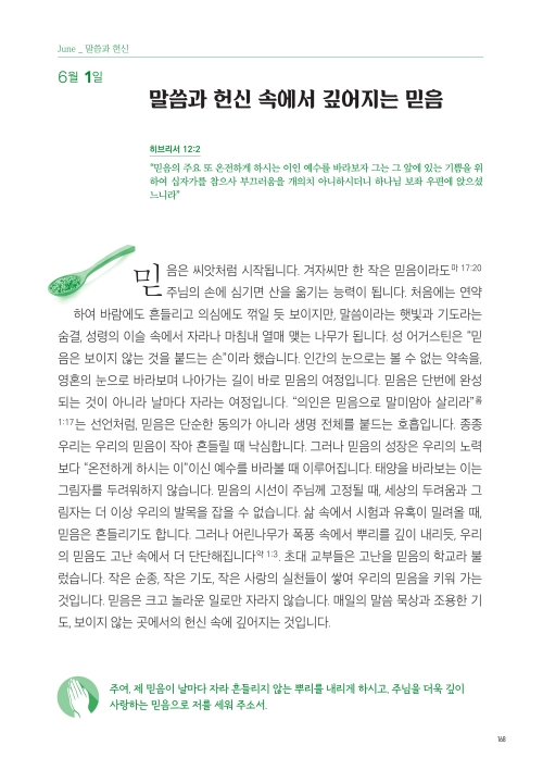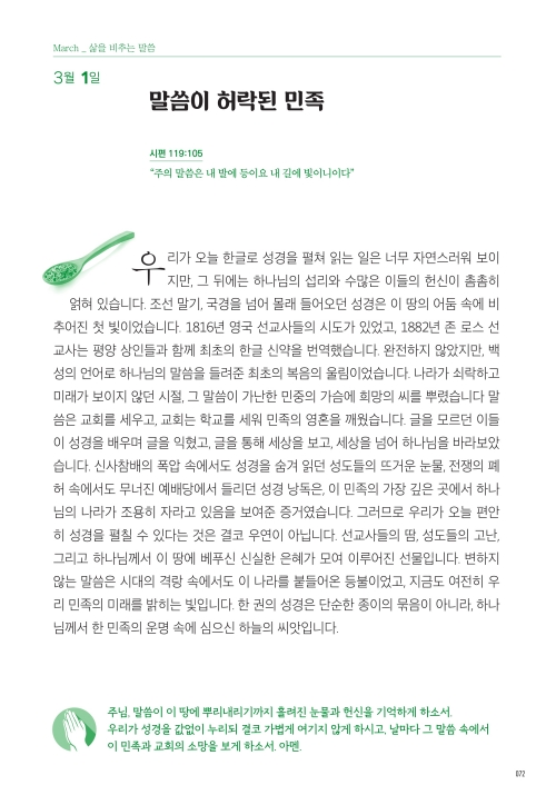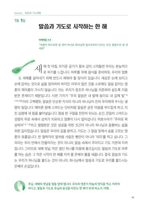 당신의 하루하루에 말씀으로 깨어나는 기쁨, 하나님을 더 사랑하게 되는 감격, 영혼이 다시 숨 쉬는 은혜가 풍성하기를 축복합니다.