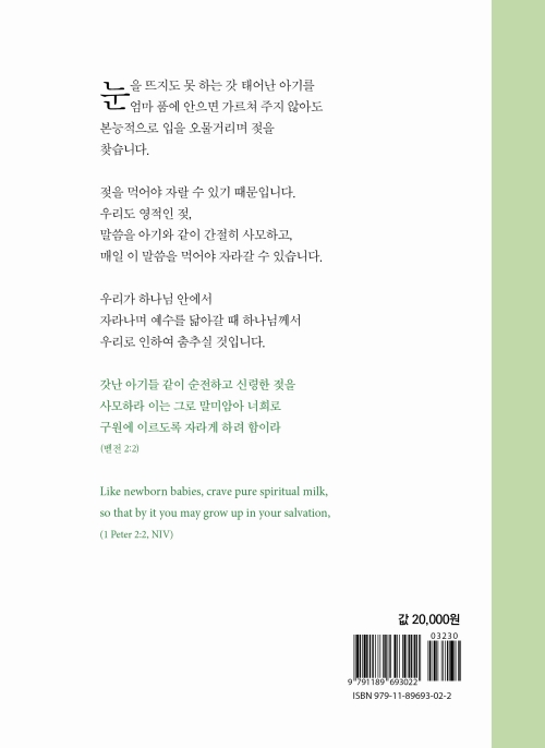 말씀 한 줄은 때때로 오래된 상처를 조용히 어루만지고, 마음 속 어둠을 서서히 밀어내며, 잊고 지낸 첫사랑을 다시 깨우기도 합니다. 은혜는 언제나 갑작스럽게 혹은 아주 천천히, 그러나 반드시 우리를 찾아옵니다. 어느 날 눈물로 말씀을 읽게 하시고, 또 어느 날은 잔잔한 평안 속에서 하나님이 가까이 계심을 느끼게 하십니다. 이 책이 독자의 영혼 안에서 그런 은혜의 흔적을 남기기를 소망합니다.