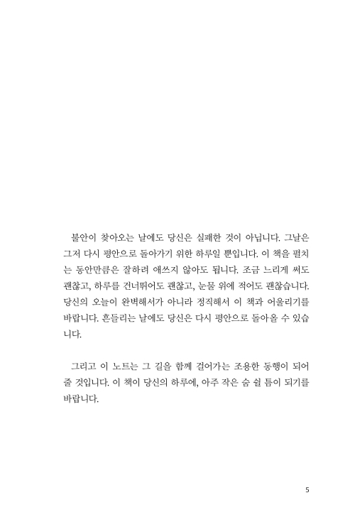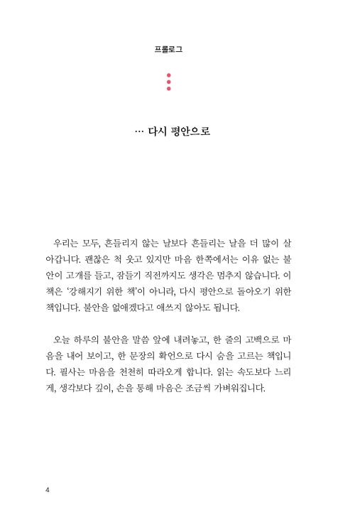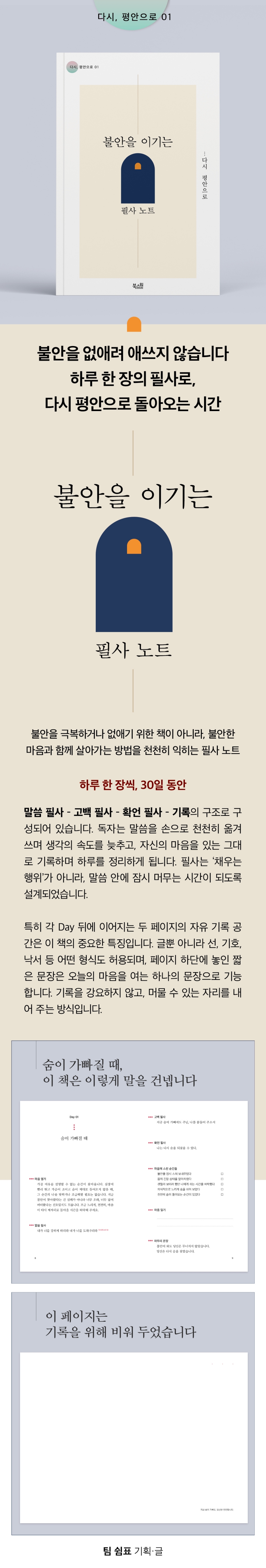 《불안을 이기는 필사 노트 … 다시 평안으로》는 불안을 극복하거나 없애기 위한 책이 아니라, 불안한 마음과 함께 살아가는 방법을 천천히 익혀 가는 필사 노트입니다.