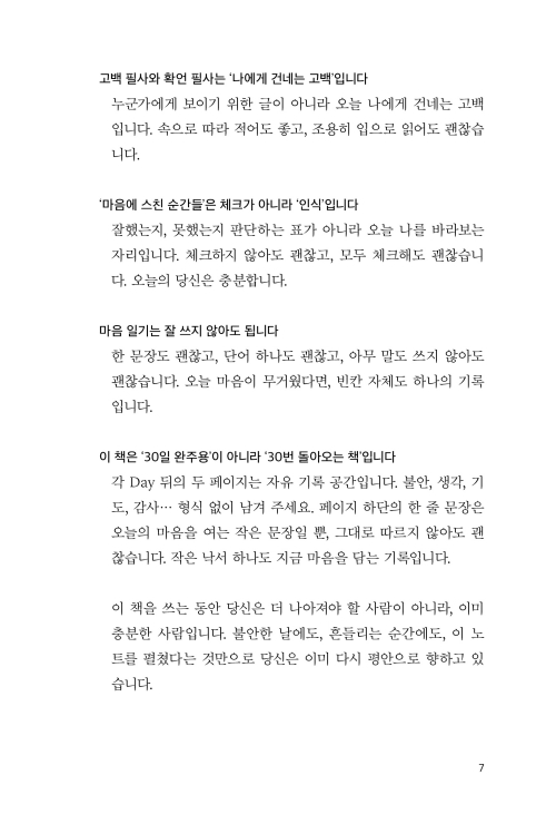 특히 각 Day 뒤에 이어지는 두 페이지의 자유 기록 공간은 이 책의 중요한 특징입니다. 글뿐 아니라 선, 기호, 낙서 등 어떤 형식도 허용되며, 페이지 하단에 놓인 짧은 문장은 오늘의 마음을 여는 하나의 문장으로 기능합니다. 기록을 강요하지 않고, 머물 수 있는 자리를 내어 주는 방식입니다.