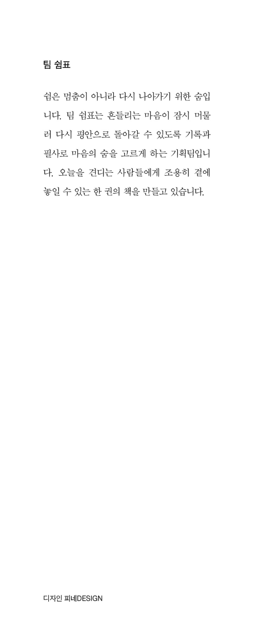 이 책을 기획한 팀 쉼표는 “빠른 판단과 빠른 말 사이에서 잠시 멈춰 숨 고를 수 있는 기록을 만들고 싶었다”고 전합니다. 책 전체에는 잘하려 애쓰지 않아도 괜찮다는 메시지가 조용히 흐릅니다. 완벽한 하루보다, 정직한 하루를 기록하는 사람에게 이 노트는 가장 잘 어울립니다.