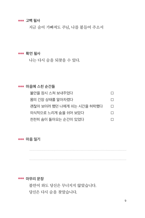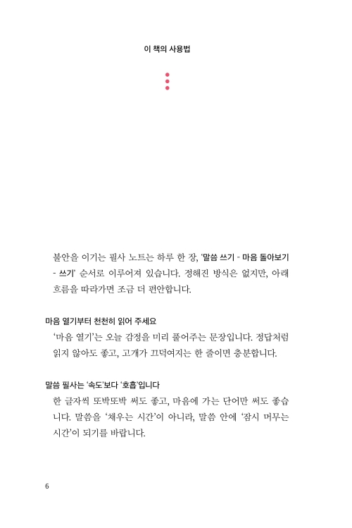 《불안을 이기는 필사 노트》는 ‘30일 완주’를 목표로 하지 않습니다. 하루를 건너뛰어도, 중간부터 다시 시작해도 괜찮습니다. 이 책은 불안을 없애는 책이 아니라, 불안한 날에도 다시 돌아올 수 있는 자리를 만들어 주는 노트이기 때문입니다.
