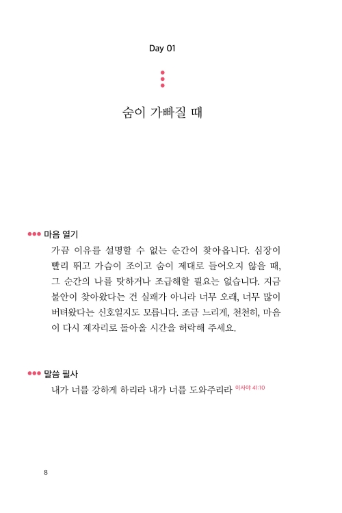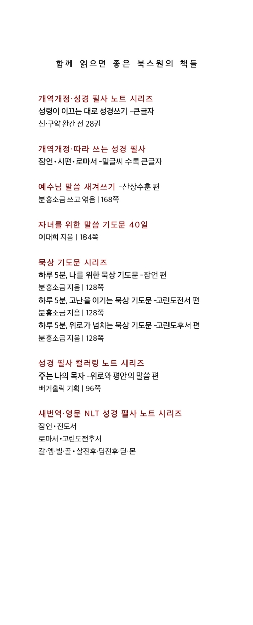 이 책은 하루 한 장씩 말씀 필사 – 고백 필사 – 확언 필사 – 기록의 구조로 구성되어 있습니다. 독자는 말씀을 손으로 천천히 옮겨 쓰며 생각의 속도를 늦추고, 자신의 마음을 있는 그대로 기록하며 하루를 정리하게 됩니다. 필사는 ‘채우는 행위’가 아니라, 말씀 안에 잠시 머무는 시간이 되도록 설계되었습니다.