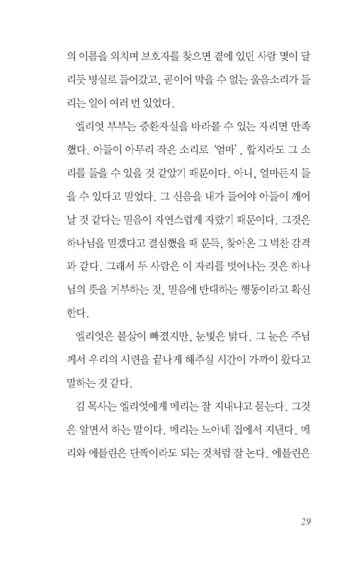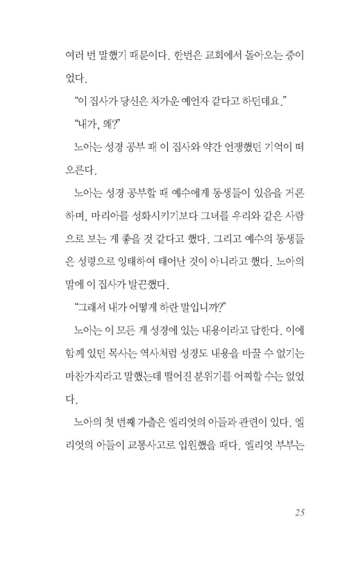 사람들은 노아와 엘리엇 가족을 피한다. (...) 문제가 될 수 있는 여지를 최소한으로 줄이며 상대의 존재 또한 무시한다. 이 바닥에서는 속마음을 내놓고 말하는 것을 상상할 수 없다. 이민 교회에서 신앙과 함께 배우는 게 속마음을 지우는 기술이다. 사람들은 그런 게 불가능하다는 것을 알면서도 종교인답게 그런 게 가능하다고 믿는다. 대부분 그런 식이다. 사람들은 기적이 일어나길 바라는 마음으로 있을 수 없는, 확인도 안 되고 재현할 수도 없는, 이야기를 실재였다며 자신을 설득하려고 애쓴다. 어쩌면 불가능한 설득에 어울리는 게 종교인지도 모른다.