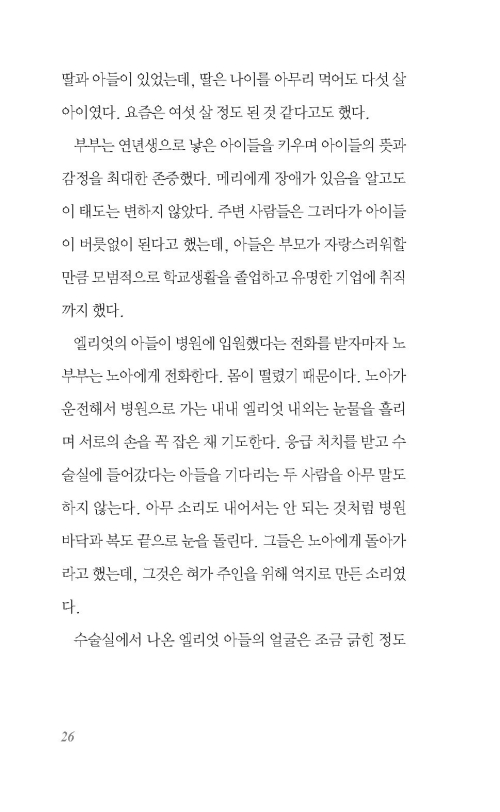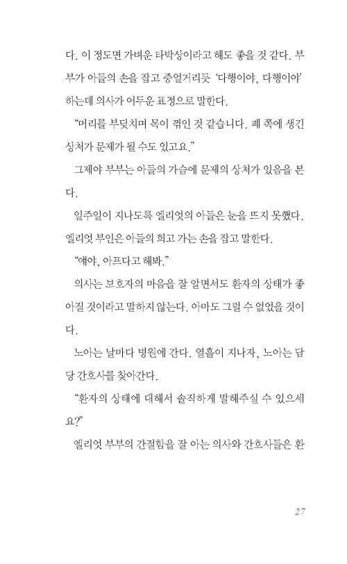 노아는 시선을 창밖으로 옮기다가 자기도 모르게 ‘성경에 의하면’이라는 문구를 딸각, 바닥에 떨어뜨린다. 노아만 들을 수 있는 말이고, 이어지지 않는 말이다. (...) 엘리엇의 아들은 사고 이후 눈을 한 번도 뜨지 못한 채 죽었다.