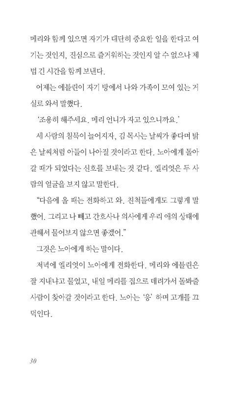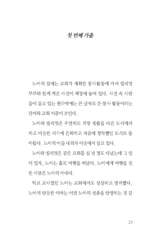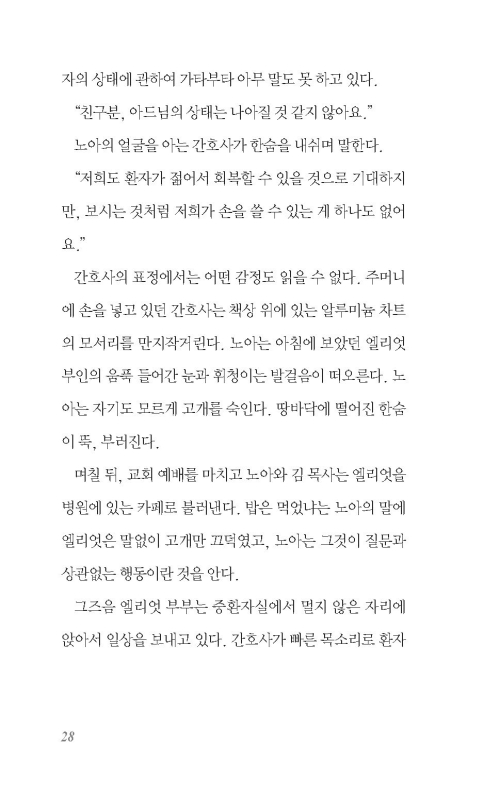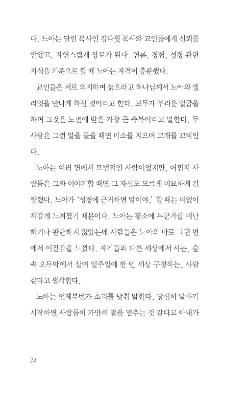 아내는 재미있는 걸 발견한 얼굴이었다. ‘그런 것 때문에 갑절이나 긴장하지 않아도 좋았을 내 인생이 가엽다고 느껴지는 그 순간, 곧바로 자기가 하고 싶은 것을 하는 게 좋을 것 같아.’ 노아는 아내가 나이와 상관없이 사는 사람 같았다. 노아는 아내의 말에서 겸손을 생각했다. 그것은 사람을 대할 때 갖는 태도나 예의가 아니라 인생에 대한 경외감이었다. 사람들은 자기 계획에 일치하는 삶을 살고 싶지만, 인생은 예상을 벗어난 길로 사람을 끌고 간다. 그것은 내 모든 것보다도 강력하며 또, 다들 그런 식으로 살았다. 색다른 어쩔 수 없음이 그곳을 차지하고 있다. 그처럼 시간과 기회가 내 손에 있지 않은데도, 나는 수시로 넘어졌는데도 여기에 내가 잘 있다. 그것은 어쩔 수 없는 것들의 결과가 아니다. 인생은 그 스스로 나에게 책임을 다하며 경건했다.