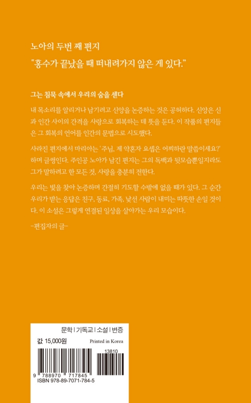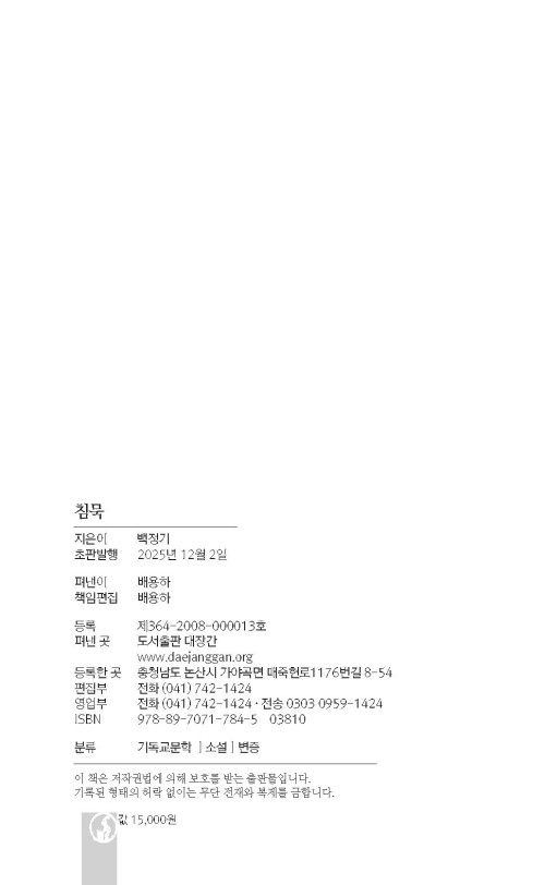 신앙이든 삶이든, 누구에게나 말할 수 없는 침묵의 시간이 있다. 『침묵』은 그 시간 속에 손을 얹고, 한 인간이 자기 자신에게 귀 기울이는 법을, 그리고 “어쩔 수 없음”과 함께 살아가는 법을 이야기한다. 진실은 말보다 먼저 아프게 다가오지만, 바로 그 침묵의 순간에서 우리가 조금 더 삶의 경건함에 가까워질 수 있음을 보여 주는 소설이다.