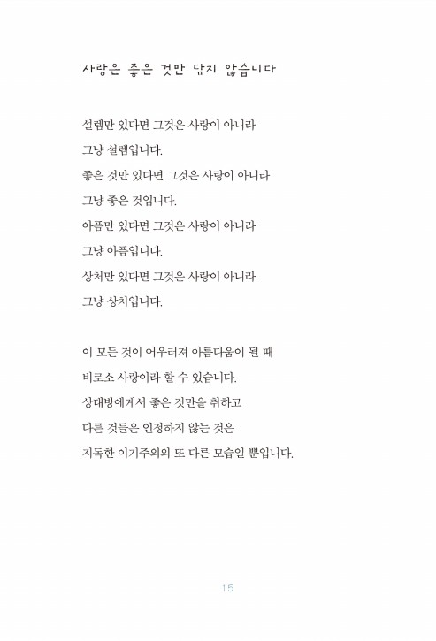그 사랑 만나러 갑니다/ 사랑은 좋은 것만 담지 않습니다/ 기분 나쁜 일 있으세요?/ 사랑의 마음을 가지십시오/ 사랑에는 이유가 없습니다/ 사랑은 원래 어렵습니다/ 사랑을 증명하십시오/ 그냥 사랑하십시오/ 원수를 사랑하라/ 사랑이 근본입니다/ 상대성과 절대성/ 좋아하는 사람이 있으세요?/ 무얼 배달하고 계세요?/ 무관심/ 산다는 것은/ 머물고 떠남에 대하여/ 사랑하고 싶으세요?/ 사랑하지 못하는 이유/ 환영합니다/ 세상이 아름답다는 것을 믿습니다/ 저와 함께 그 길을 가실래요?/ 보고 싶습니다 1/ 보고 싶습니다 2/ 인생의 큰 행복/ 힘든 일이 있으세요?/ 기도하기를 배운다면/ 미안합니다/ 혹시 지금 외로우세요?/ 아름다운 만남을 위하여/ 가장 큰 축복/ 혹시 짜증나세요?/ 우리를 힘들게 하는 것들/ 사랑은 아픔입니다/ 사랑하면/ 나를 사랑하세요?/ 어른이 되어가세요/ 사랑은 존재만으로도 아름답습니다/ 다가가기 힘든 사람이 있나요?/ 무엇을 남기고 계세요?/ 사랑을 지키고 계세요?/ 상처 / 사랑하는 사람이 떠날까 봐 걱정되세요?/ 기다림은 희망입니다 1/ 기다림은 희망입니다 2/ 진정한 친구가 볼 수 있는 것들/ 감사와 불평/ 사랑은 감정이 아니라 의무입니다/ 한 남자와 한 여자/ 천국과 지옥의 차이/ 남녀관계의 정석/ 사랑은 빛을 주는 것/ 소중히 여기세요?/ 사랑하면 벙어리가 됩니다/ 삶의 신비/ 약자가 되십시오/ 사랑은 기적입니다/ 진정한 사랑/ 어떤 때인지 아세요?/ 인간관계에서 상처받으세요?/ 어느 날/ 내어줌/ 정의로서의 사랑/ 사람 간의 갈등을 푸는 법/ 상실의 기쁨/ 더 좋은 것을 사모하십시오/ 사랑하게 되셨나요?/ 사랑은 더 사랑하는 것입니다/ 어떤 사람이세요?/ 남 탓할 필요 없습니다/ 무엇을 품고 있으세요?/ 아름다운 삶의 시작/ 사랑의 자리/ 사랑하는 법을 배우세요/ 가족/ 가장 행복한 사람/ 혹시 상처받으셨나요?