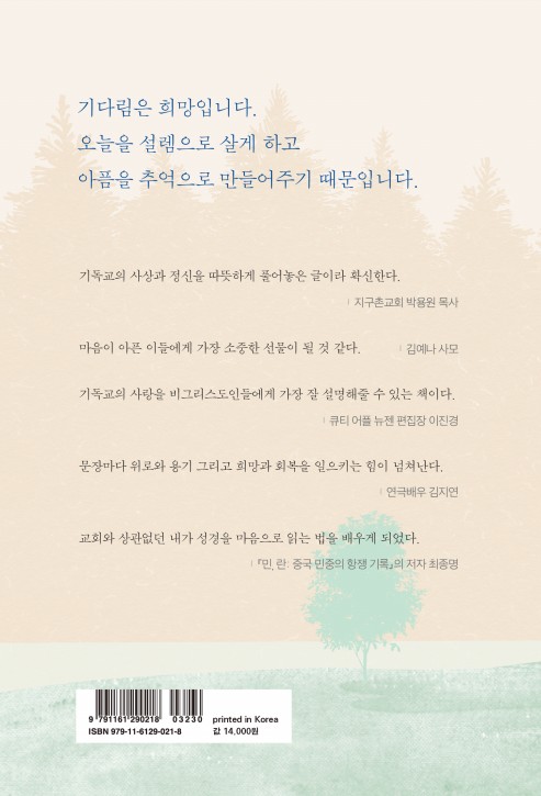 저자는 전문적인 신학 공부를 마친 신학자이지만, 일반 대학교에서 학생들을 가르치면서 감성적인 언어로 복음을 번역할 줄 아는 탁월한 안목을 가졌다. 이 책은 기다림, 희망, 사랑, 희생, 고난, 상처, 사명과 같은 주제를 깊이 묵상할 수 있도록 도우면서 젊은이들이 쉽고 빠르게 읽을 수 있도록 문장의 호흡과 길이를 간결하게 끊어서 서술했다. 교회를 점점 멀리하는 젊은이들에게는 다시 기독교의 메시지가 얼마나 매력적인지를 일깨워주고, 말씀을 현대적인 감수성으로 읽고자 하는 이들에게는 좋은 선물이 될 것이다.