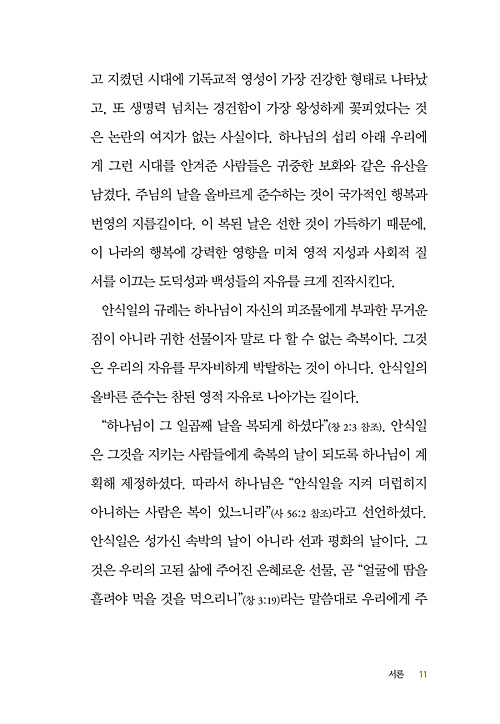 저자는 이 책에서 주일의 의무는 단지 주일 예배에 참여하는 것으로 끝나지 않는다고 강조한다. 많은 그리스도인들이 한두 차례 예배만 참석하면 주일의 의무를 온전히 이행했다고 생각한다. 온라인 예배를 포함해서 단지 주일 예배 참석만으로 끝나지 않는다. 주일은 보다 적극적으로 하나님의 안식으로 들어가는 날이며, 예수님께서 부활하신 주님의 날(the Lord's day)이다. 예수님의 부활을 기억함으로, 새로운 한 주간의 시작을 위하여 다시 새롭게 부활을 경험하는 날이다. 사실 주일은 이 천 년이 넘는 기독교 역사를 지켜온 중요한 기독교적 가치를 지닌 날이며, 믿음의 조상들은 이 날을 목숨을 걸고 지켜왔다. “그리스도인들은 이 주일을 어떻게 보내야 할 것인가?”