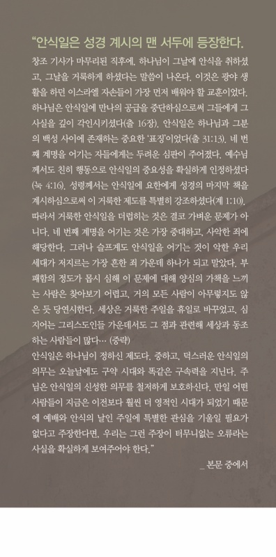 “본서는 안식일 계명이 단지 열 가지 계명 중 하나에 국한된 문제가 아니라 하나님의 구속경륜을 어떻게 이해하고 적용해야 하는 지를 논증한다는 점에서 신학적이며, 두려움과 방종 어느 한 극단에 치우치지 않으면서 안식일을 거룩히 지키도록 격려한다는 점에서 실천적입니다. 주일성수 개념이 무너진 이 시대를 일으켜 세우는 든든한 기둥이 될 것임을 의심치 않습니다”.