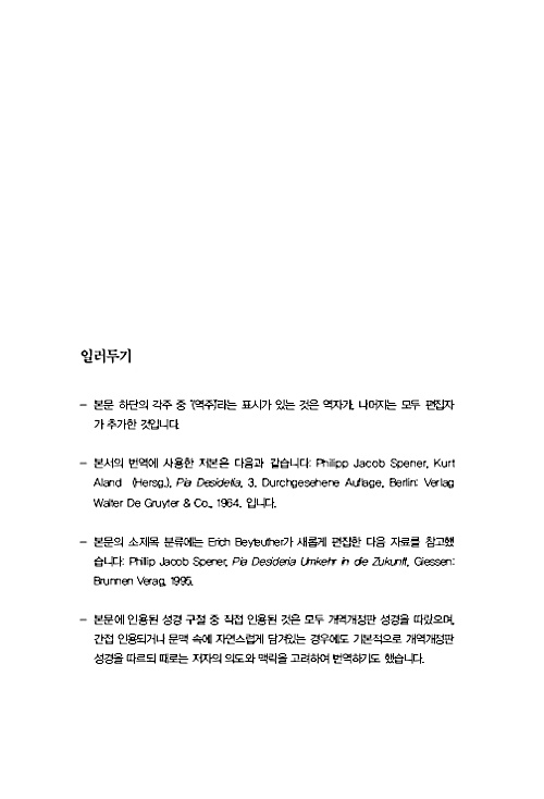 끝으로 이번에 출간된 번역본에 대해 말해 두고자 한다. 마치 우리말로 쓴 것처럼 자연스럽게 읽히는 번역과 문단을 묶어 짧은 소제목으로 친절하게 정리한 구성, 또한 세심한 편집자 주 등 여러모로 책의 완성도를 높였다. 이 역본을 슈페너가 제안한 방법을 따라 성경과 함께 읽는 소그룹 독서 교재로 삼아 활용하기를 추천한다.