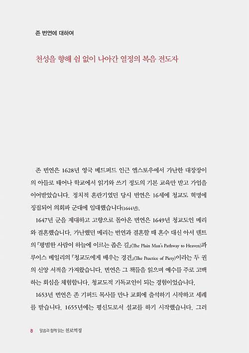 『천로역정』은 장차 멸망할 이 세상을 떠나 하나님 나라(천성)를 향해 나아가는 한 순례자의 여정을 묘사한다.하지만 이 책은 단순한 신앙 소설이 아니다.조금만 유심히 읽어 보면 이 책은 처음부터 마지막까지 성경을 인용한다.성경이 『천로역정』의 중심이다.성경으로 『천로역정』을 쓴 까닭에 이 책을 읽으면 성경 말씀이 보이고 복음이 쉽게 이해된다.그래서 그토록 많은 사람이 읽고 감명을 받은 것이다.
