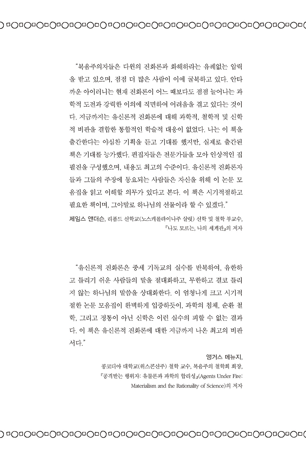 “창조-진화 논쟁에 대한 유신론적 진화론 방식의 해결은 이 책에서 실질적이고, 지속적이고, 날카로운 비판을 만나게 된다. 편집자들이 모은 과학, 철학 및 신학 분야 학자들의 팀은 힘을 합해 이 존경받는 이론에 대해 신랄한 도전으로 맞섰다. 유신론적 진화론의 지지자들이 학자적 진실성을 중요하게 여긴다면, 이 도전에 응답해야 할 것이다. 이 책은 생명의 기원을 둘러싼 중요한 문제들과 씨름하는 사람들이 반드시 읽어야 할 책이다.”