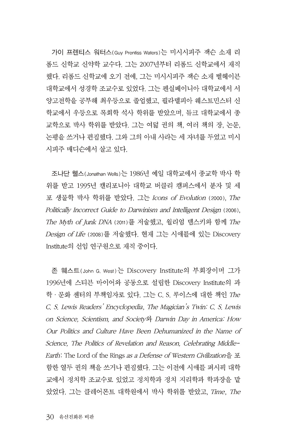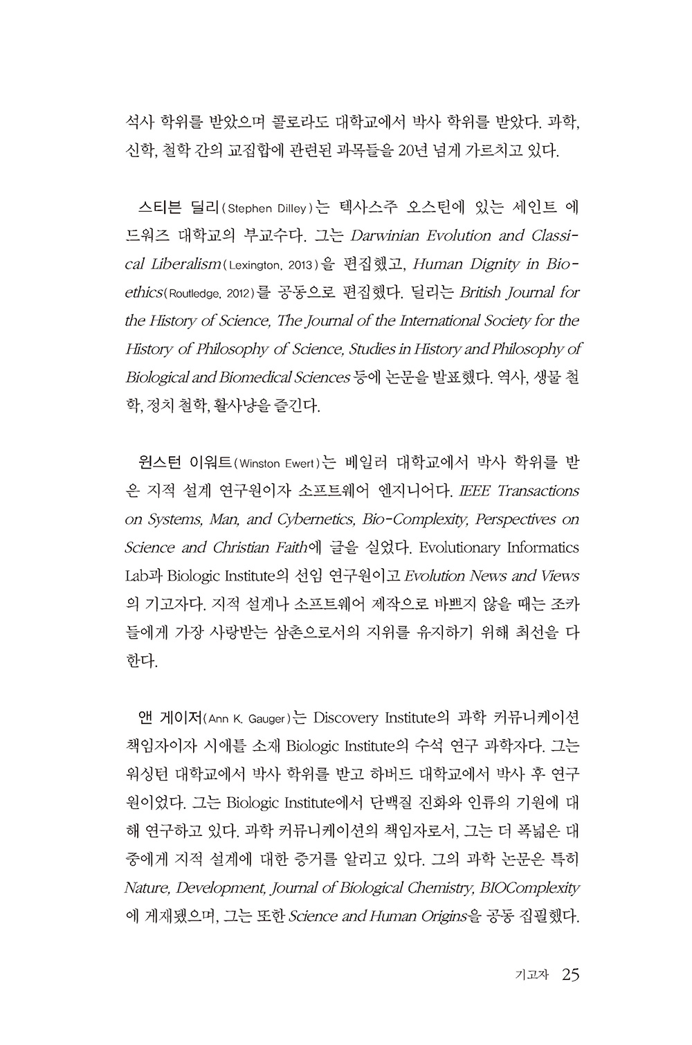 모어랜드: 북미와 유럽의 많은 사람들은 이미 이 책을 “권위 있는 책”, “유신진화론과 자연주의 진화론에 대한 최고의 비판서”, “시중에서 가장 신뢰할 만한 유신진화론 비판서”라고 부르고 있습니다. 이 책은 유럽과 북미의 세계적인 학자들(총 25명)이 각자의 전문 분야에 대해 쓴 책입니다. 열린 사고를 하는 사람이라면, 저자들의 이력을 보면서 지적 설계론이 어리석다거나 비합리적이라고 말할 수 없을 것입니다. 이 책을 읽고도 여전히 지적 설계론을 지지하지 않을 수는 있지만, 이 책을 읽고 난 순간부터 지적 설계론이 반지성적이라거나 맹목적 신앙을 표현한 것이라고 주장하는 것은 지적으로 부정직한 행동일 것입니다. 저희는 그저 여러분이 이 책을 열린 사고로 읽어 주시기만을 바랍니다. 여러분이 만약 그렇게 하신다면, 저희는 정말 많은 분들이 자신의 견해를 바꾸실 것이라고 생각합니다.