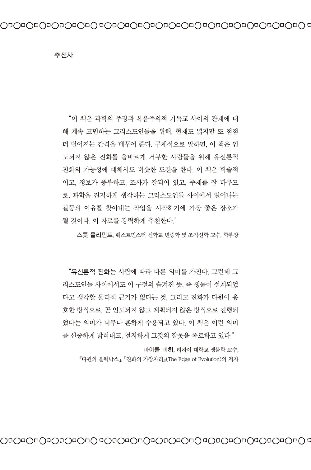 “이 책은 과학의 주장과 복음주의적 기독교 사이의 관계에 대해 계속 고민하는 그리스도인들을 위해, 현재도 넓지만 또 점점 더 벌어지는 간격을 메꾸어 준다. 구체적으로 말하면, 이 책은 인도되지 않은 진화를 올바르게 거부한 사람들을 위해 유신론적 진화의 가능성에 대해서도 비슷한 도전을 한다. 이 책은 학술적이고, 정보가 풍부하고, 조사가 잘되어 있고, 주제를 잘 다루므로, 과학을 진지하게 생각하는 그리스도인들 사이에서 일어나는 갈등의 이유를 찾아내는 작업을 시작하기에 가장 좋은 장소가 될 것이다. 이 자료를 강력하게 추천한다.”