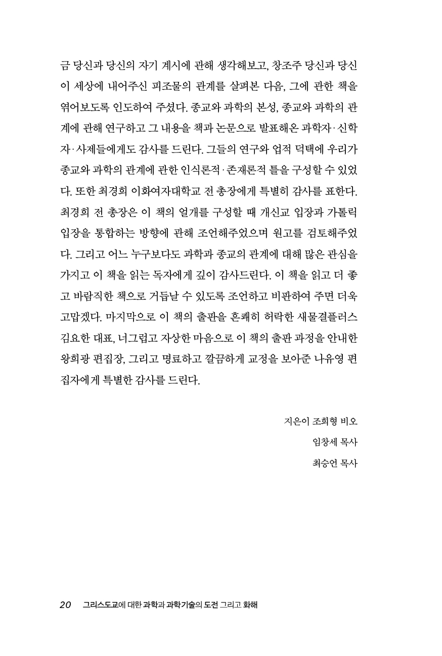 오랫동안 과학과 종교의 관계 향상을 위해 애써온 세 분 저자의 노력에 경의를 표한다. 이 책의 제목처럼 과학과 종교 간 갈등 해결의 마침표가 아니라 종교와 과학의 화해를 향한 의미 있는 출발이 되기를 바란다.