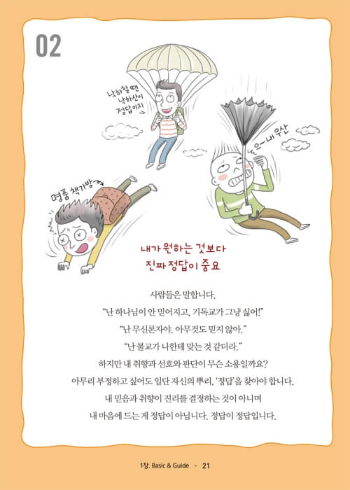 저자는 인간의 삶과 구원, 천국과 지옥 등 한 페이지에 한 가지씩 기독교와 관련된 주제를 간단명료하게 표현함으로써 한두 시간에 기독교 교리를 완독할 수 있도록 돕는다. 본문은 총 5개 파트로 나누어 배치되었다. 1장에는 기독교를 믿지 않거나 관심이 있는 사람들을 위해 가장 기본적인 상식과 믿는다는 것의 원리를, 2장에는 구원에 대한 교리들, 3장에는 구원에 대한 다양한 궁금증, 4장에는 기독교 기타 지식들과 타종교를 통한 증거들, 5장에는 천국과 지옥에 대한 진실과 궁금증을 담았다. 오해와 반감으로 기독교를 진리로 받아들이지 못하는 사람들, 관심이 있지만 섣불리 다가가지 못하는 사람들, 그런 사람들을 돕고자 고민하는 크리스천들에게도 이 책은 적절하고 좋은 선물이다. 많이 읽고 들어봤음에도 입 안에서 맴돌 뿐 막상 복음을 쉽게 말로 전달하기 어려웠던 이들이라면 이 책이 고마운 전도의 도구가 되어줄 것이다.