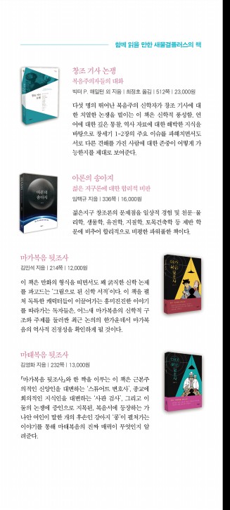연재되는 동안 한 편도 빠뜨리지 않고 즐겁게 따라 읽었던 독자로서 마침내 이렇게 한 권의 책으로 출간되고, 게다가 출간된 도서에는 연재에 없던 분량까지 있으니 더욱 기쁘다. 지루하고 장황할 수 있는 창조에 대한 신학과 과학 사이의 논쟁을 이렇게 재미있게 만들어낸 그 상상력과 손길에 복 있을진저. _김근주(기독연구원 느헤미야 구약학 교수)