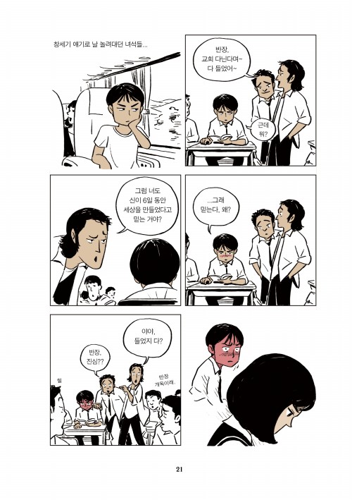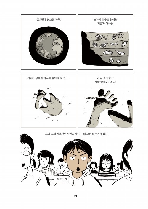 성경 웹툰 서적인 『마가복음 뒷조사』로 큰 인기를 얻은 김민석 작가가 이번에는 기독교 신앙과 과학 간의 관계를 그려냈다. 현재 한국교회 다수를 지배하는 젊은지구 창조론의 문제점과, 오랜지구 창조론, 진화적 창조론 및 우주 성전론에 이르기까지 창세기 1장을 둘러싼 다양한 신학적 해석과 더불어 그것이 현대과학과 맺고 있는 함의에 대해 쉽고 재미있게 그려냈다. 이 책은 누구나 한 번 이상 고민했을 법한 주제를 다룬다. 준이와 수영을 중심으로 펼쳐지는 교회 청소년들의 신앙과 사랑, 우정과 고민을 따라가다 보면 어느덧 옛 학창시절의 추억 속에 깊이 빠져들 것이다. 기독교 신앙과 과학의 관계에 대해 관심이 있지만 막상 체계적으로 공부하려면 신학과 과학의 특성 때문에 망설여지는 기독교인들에게 이 책은 친절한 길라잡이가 될 것이다.