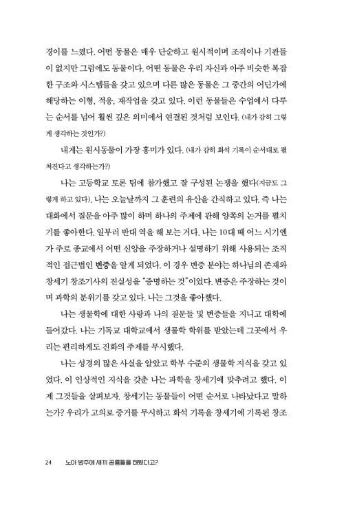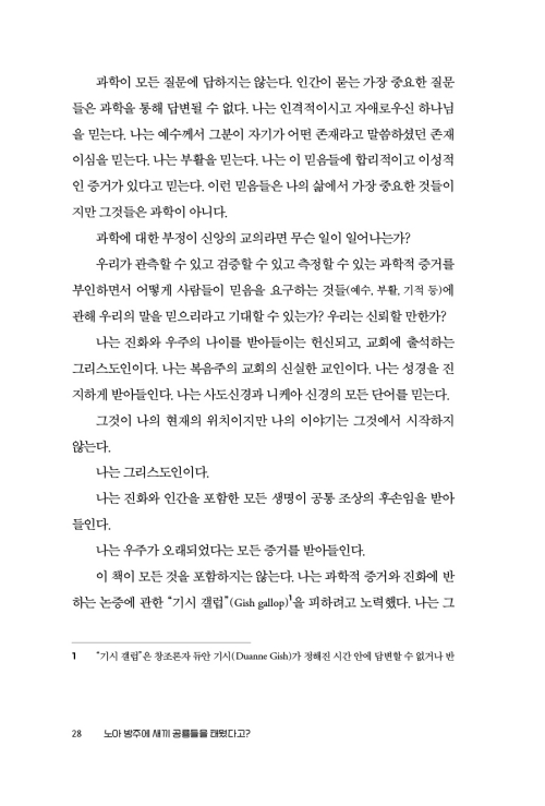여전히 성경과 과학 사이에서 하나를 택해야 한다고 여기는 풍토가 만연하다. 그러나 과학적 상식을 인정하는 것은 결코 (일본 에도 시대에 기독교 신자들을 색출하기 위해 사용되었던 방법으로서 의심되는 사람들에게 예수나 마리아 그림이 그려진 판을 밟게 하여 그들이 기독교 참으로 신자인지를 확인하는 데 사용되었던) 후미에를 밟는 게 아니다. 신앙을 지키기 위해 과학을 버리는 건 비상식적이고 반지성적인 일일 뿐이다. 이것은 또한 선과 악의 문제도, 진실과 거짓의 문제도, 옳고 그름의 문제도 아니다. 성경과 과학 둘 다 필요하다. 성경과 과학은 모두 하나님이 주신 것이기 때문이다. 그러므로 하나님의 백성은 건강한 신앙을 위해 성경과 과학을 함께 아울러야 한다. 이것은 우유부단함도, 비겁한 중립도, 어정쩡한 타협도 아니다. 그리스도인으로서 믿음과 이성을 겸비하는 것은 창조주 하나님을 믿고 찬양하는 가장 바른 길이다. 창세기는 천지를 누가, 왜 창조했는지 알려준다. 과학은 언제, 어떻게 창조했는지에 대해 답한다. 어떤 질문도 버릴 것이 없다. 온전한 창조 신앙을 견지하기 위해서는 성경과 과학이 모두 필요하다. 과학은 신앙을 대적하지 않는다. 더욱 깊고 풍성하게 해 줄 뿐이다. 이 책을 읽으면 하나님을 믿는 신앙을 견지하면서 동시에 (젊은 지구 창조론을 옹호하기 위해) 노아의 방주에 새끼 공룡을 태웠다고 주장하는 등 불필요한 지적 곡예를 감행할 필요가 없다는 사실을 알게 될 것이다.