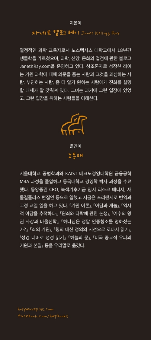 저자 자네트 켈로그 레이는 생물학 교수이자 신실한 그리스도인이다. 젊은 시절, 그녀는 문자주의적 성경 해석에 바탕을 둔 “젊은 지구 창조론”을 확신했다. 그러나 그녀는 학문적 연구를 통해 자연의 복잡성과 정교한 질서를 마주하면서, 신앙을 잃지 않으면서도 과학적 사실을 외면하지 않을 수 있는 새로운 믿음의 길을 탐색하게 된다. 이 책은 그 깊은 신앙적, 지적 여정을 바탕으로, 하나님이 주신 두 가지 계시—성경과 자연—가 결코 모순되지 않는다는 사실을 설득력 있게 풀어낸다.